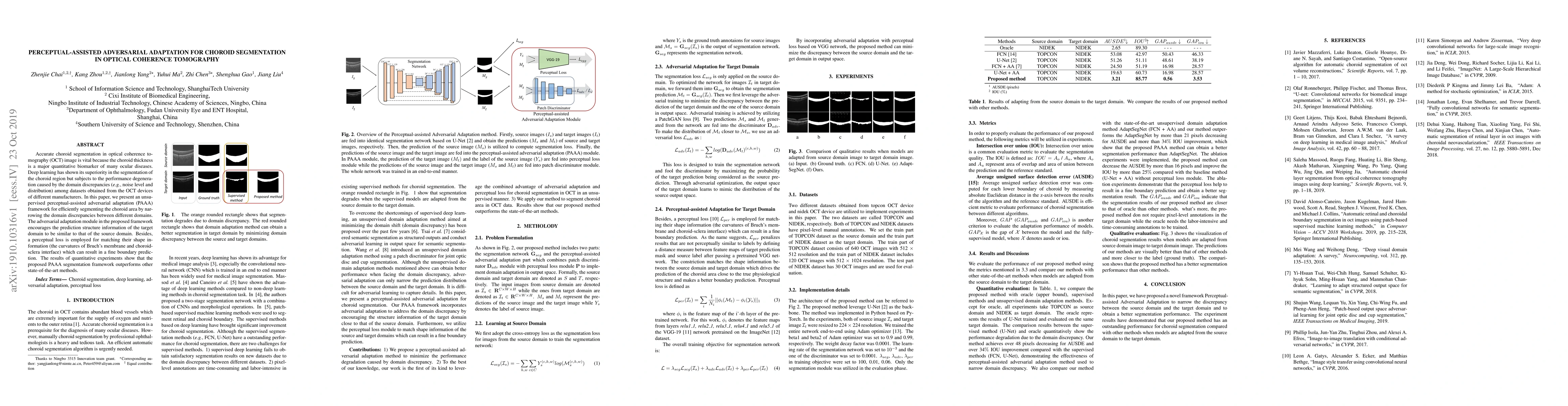 This paper introduces an unsupervised perceptual-assisted adversarial adaptation (PAAA) framework to segment the choroid in OCT images, addressing domain discrepancies between different OCT devices. The framework uses adversarial adaptation to align prediction structures and a perceptual loss to match shape information, resulting in superior segmentation performance compared to other methods.