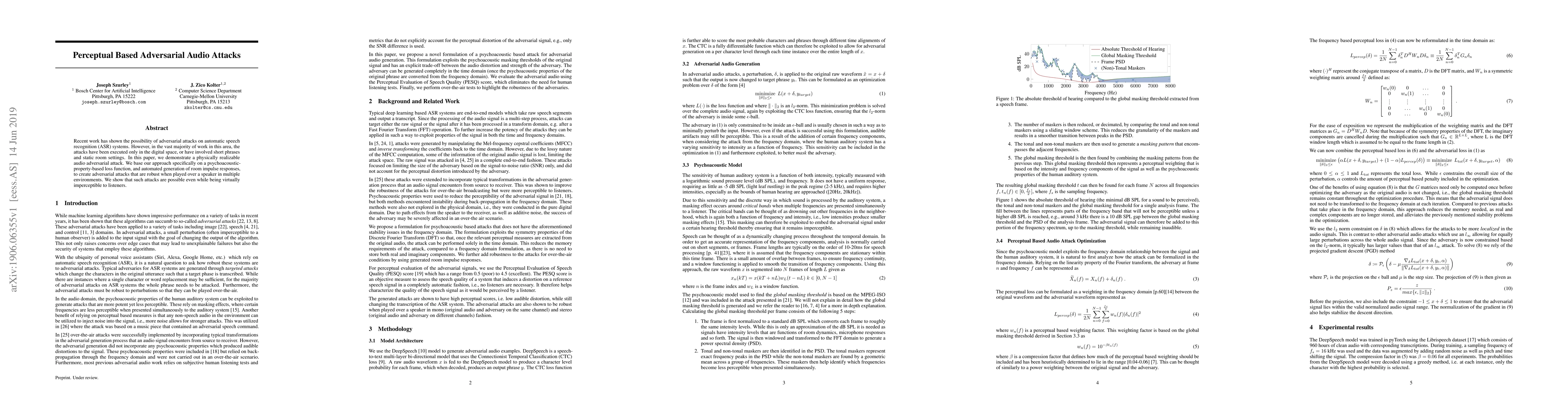 Recent work has shown the possibility of adversarial attacks on automatic speechrecognition (ASR) systems. However, in the vast majority of work in this area, theattacks have been executed only in the digital space, or have involved short phrasesand static room settings. In this paper, we demonstrate a physically realizableaudio adversarial attack. We base our approach specifically on a psychoacoustic-property-based loss function, and automated generation of room impulse responses, to create adversarial attacks that are robust when played over a speaker in multiple environments. We show that such attacks are possible even while being virtually imperceptible to listeners.