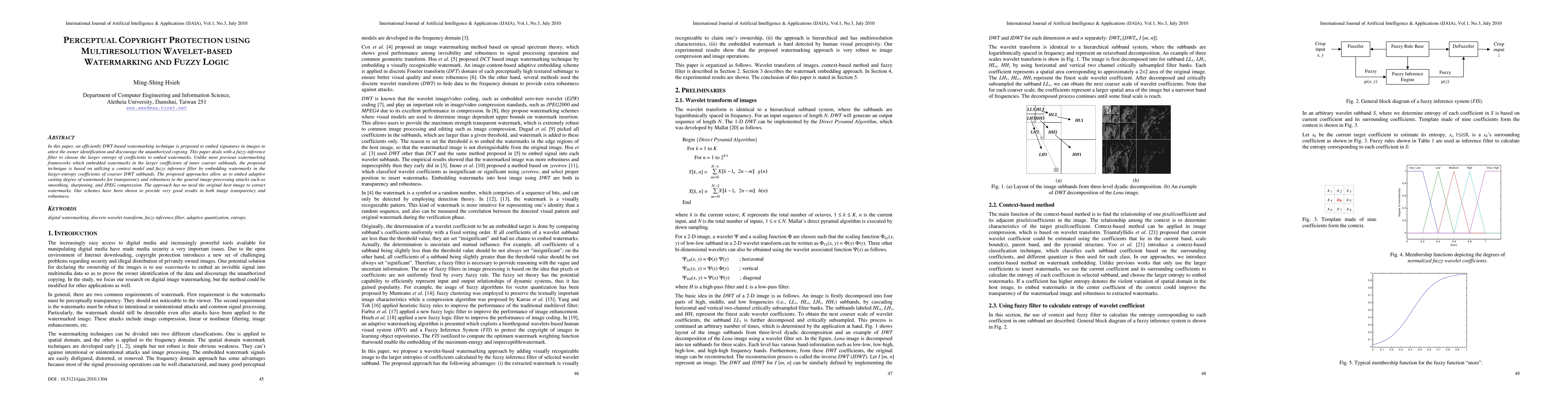 In this paper, an efficiently DWT-based watermarking technique is proposed to embed signatures in images to attest the owner identification and discourage the unauthorized copying. This paper deals with a fuzzy inference filter to choose the larger entropy of coefficients to embed watermarks. Unlike most previous watermarking frameworks which embedded watermarks in the larger coefficients of inner coarser subbands, the proposed technique is based on utilizing a context model and fuzzy inference filter by embedding watermarks in the larger-entropy coefficients of coarser DWT subbands. The proposed approaches allow us to embed adaptive casting degree of watermarks for transparency and robustness to the general image-processing attacks such as smoothing, sharpening, and JPEG compression. The approach has no need the original host image to extract watermarks. Our schemes have been shown to provide very good results in both image transparency and robustness.