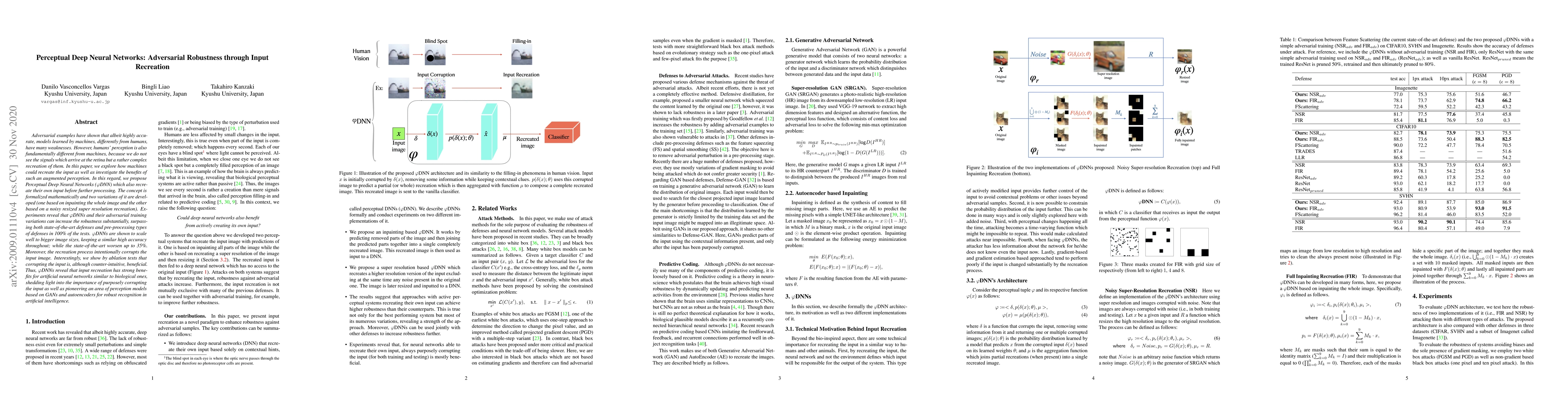 Adversarial examples have shown that albeit highly accurate, models learned by machines, differently from humans, have many weaknesses. However, humans' perception is also fundamentally different from machines, because we do not see the signals which arrive at the retina but a rather complex recreation of them. In this paper, we explore how machines could recreate the input as well as investigate the benefits of such an augmented perception. In this regard, we propose Perceptual Deep Neural Networks ($\varphi$DNN) which also recreate their own input before further processing. The concept is formalized mathematically and two variations of it are developed (one based on inpainting the whole image and the other based on a noisy resized super resolution recreation). Experiments reveal that $\varphi$DNNs and their adversarial training variations can increase the robustness substantially, surpassing both state-of-the-art defenses and pre-processing types of defenses in 100% of the tests. $\varphi$DNNs are shown to scale well to bigger image sizes, keeping a similar high accuracy throughout; while the state-of-the-art worsen up to 35%. Moreover, the recreation process intentionally corrupts the input image. Interestingly, we show by ablation tests that corrupting the input is, although counter-intuitive, beneficial. Thus, $\varphi$DNNs reveal that input recreation has strong benefits for artificial neural networks similar to biological ones, shedding light into the importance of purposely corrupting the input as well as pioneering an area of perception models based on GANs and autoencoders for robust recognition in artificial intelligence.