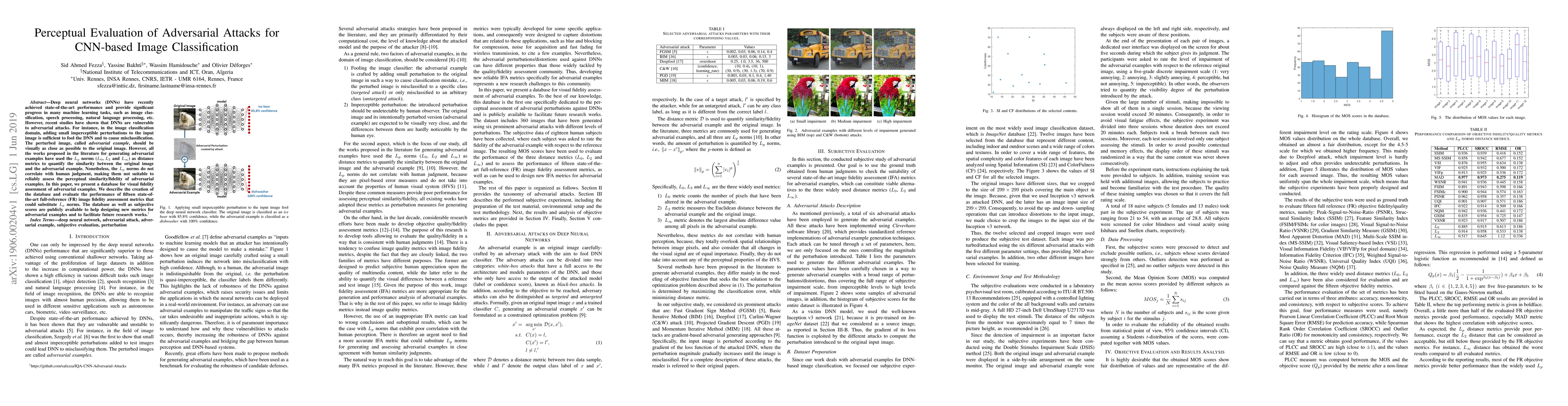 Deep neural networks (DNNs) have recently achieved state-of-the-art performance and provide significant progress in many machine learning tasks, such as image classification, speech processing, natural language processing, etc. However, recent studies have shown that DNNs are vulnerable to adversarial attacks. For instance, in the image classification domain, adding small imperceptible perturbations to the input image is sufficient to fool the DNN and to cause misclassification. The perturbed image, called \textit{adversarial example}, should be visually as close as possible to the original image. However, all the works proposed in the literature for generating adversarial examples have used the $L_{p}$ norms ($L_{0}$, $L_{2}$ and $L_{\infty}$) as distance metrics to quantify the similarity between the original image and the adversarial example. Nonetheless, the $L_{p}$ norms do not correlate with human judgment, making them not suitable to reliably assess the perceptual similarity/fidelity of adversarial examples. In this paper, we present a database for visual fidelity assessment of adversarial examples. We describe the creation of the database and evaluate the performance of fifteen state-of-the-art full-reference (FR) image fidelity assessment metrics that could substitute $L_{p}$ norms. The database as well as subjective scores are publicly available to help designing new metrics for adversarial examples and to facilitate future research works.