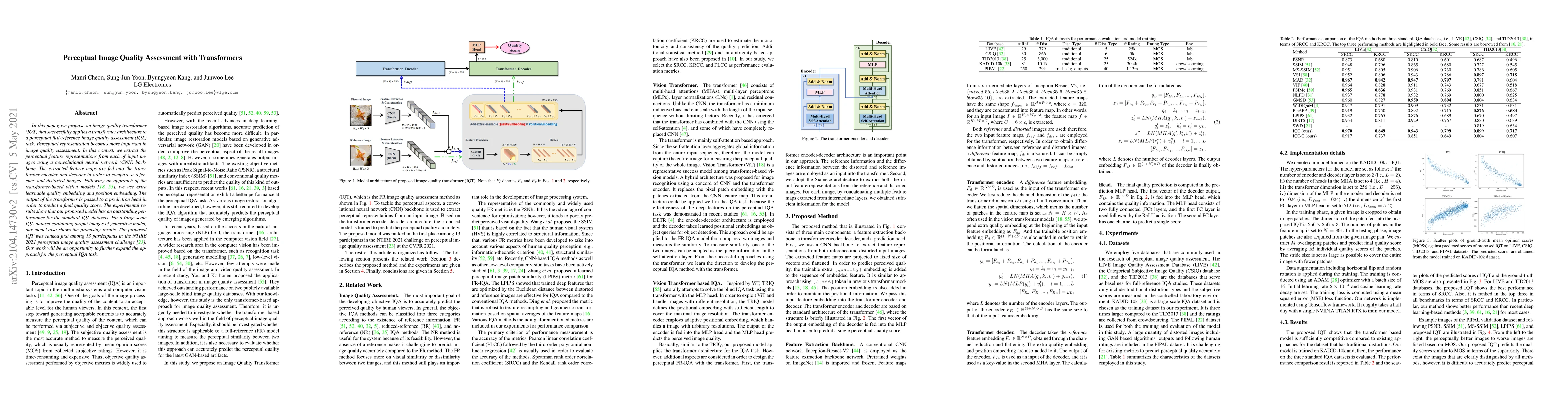 This paper proposes an Image Quality Transformer (IQT) that leverages a transformer architecture for perceptual full-reference image quality assessment, achieving top performance in the NTIRE 2021 challenge. The model uses a CNN to extract perceptual features, which are then processed by a transformer to compare reference and distorted images, ultimately predicting quality scores.