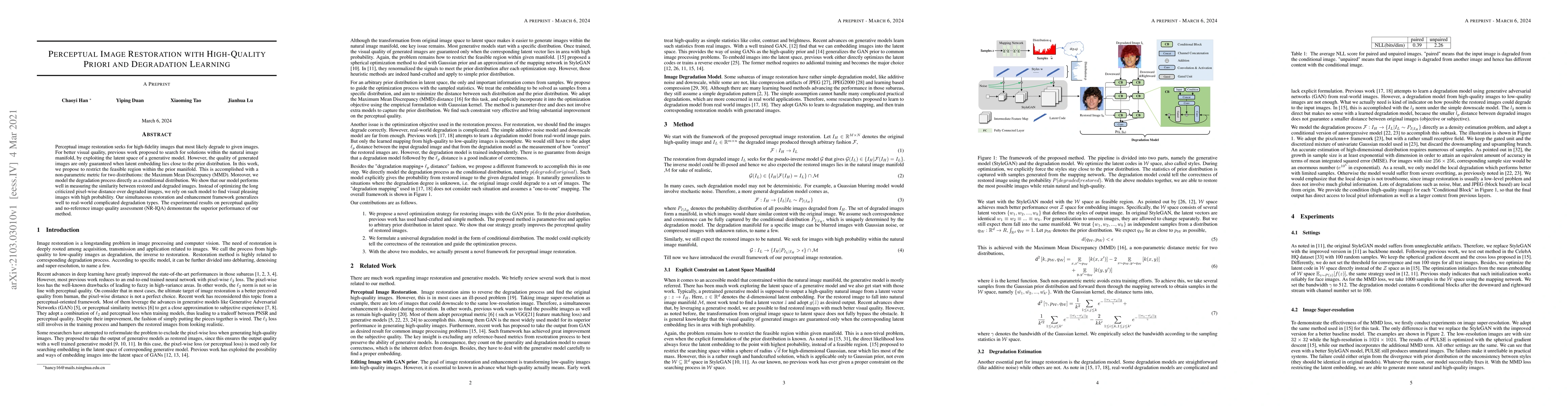 This paper proposes a perceptual image restoration method that uses Maximum Mean Discrepancy (MMD) to restrict the feasible region within the prior manifold and models degradation as a conditional distribution, achieving high-quality restorations that generalize to complex degradation types. The method outperforms traditional pixel-wise distance metrics in perceptual quality assessments.