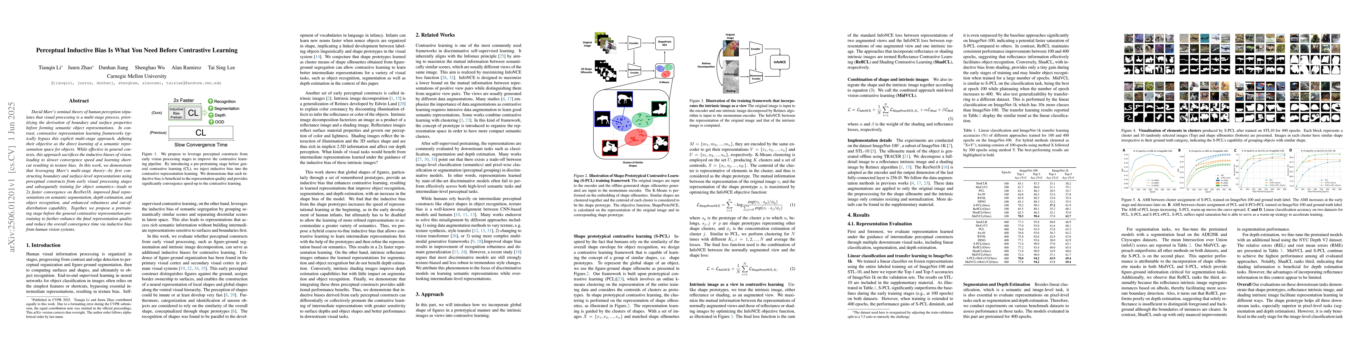 Contrastive learning can be improved by incorporating perceptual inductive bias from Marr's visual processing theory, resulting in faster convergence and better performance on object recognition tasks.