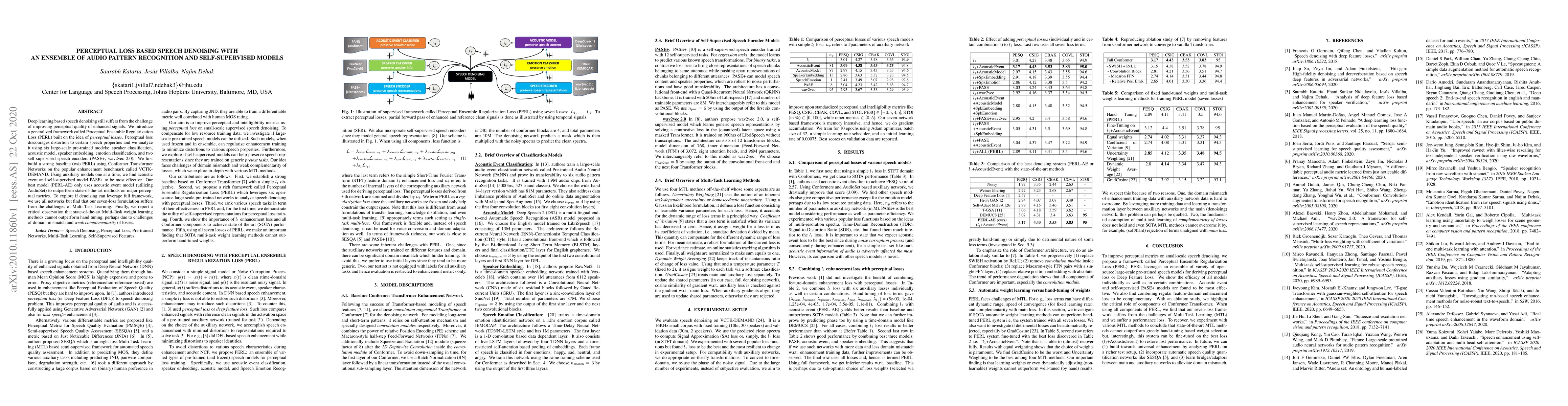 This paper introduces a Perceptual Ensemble Regularization Loss (PERL) framework for speech denoising using perceptual losses and an ensemble of pre-trained models. The best-performing model, PERL-AE, utilizes an acoustic event model to outperform state-of-the-art methods on perceptual metrics, while the full ensemble framework struggles with multi-task learning challenges.