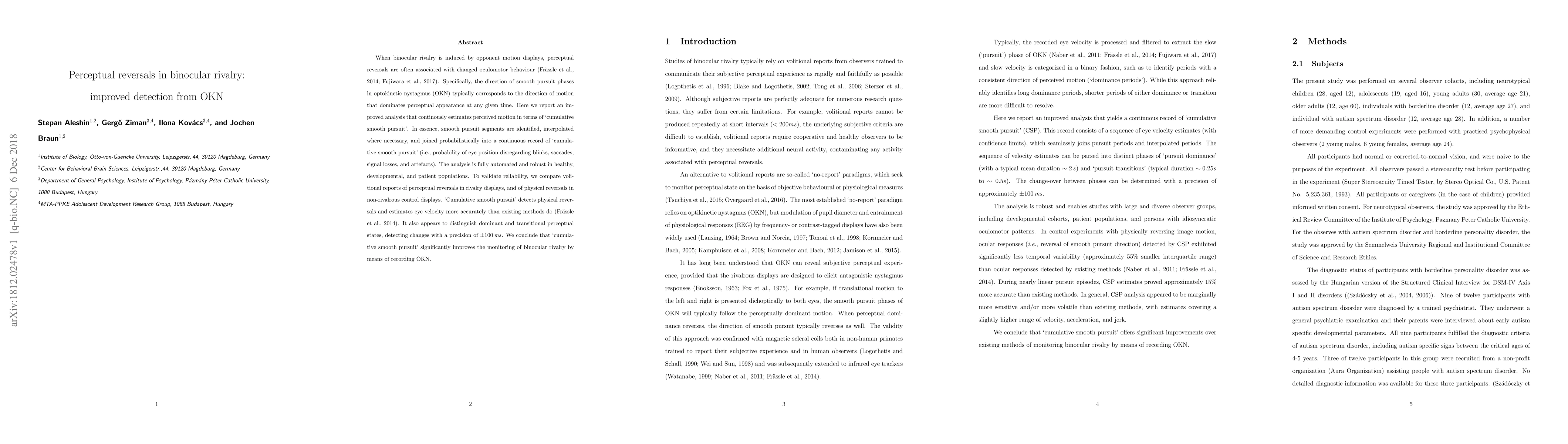 This paper introduces an improved method for detecting perceptual reversals in binocular rivalry using optokinetic nystagmus (OKN), termed "cumulative smooth pursuit," which provides a continuous and probabilistic record of perceived motion. The method outperforms existing techniques in detecting physical reversals and estimating eye velocity, offering enhanced precision in monitoring rivalry states.