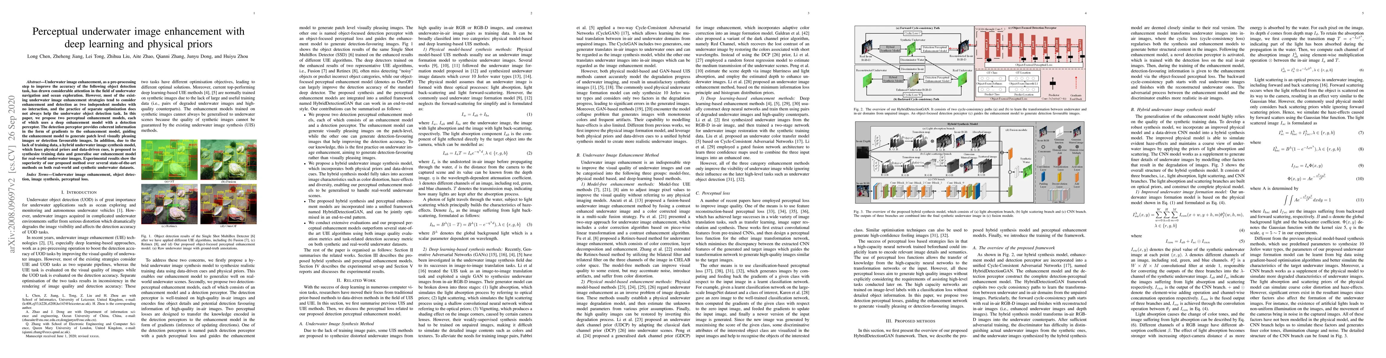 This paper proposes two perceptual enhancement models for underwater images that integrate deep learning with physical priors to improve object detection. The models use a detection perceptor to guide the enhancement process, and a hybrid synthesis model to generate training data, achieving superior performance compared to state-of-the-art methods.
