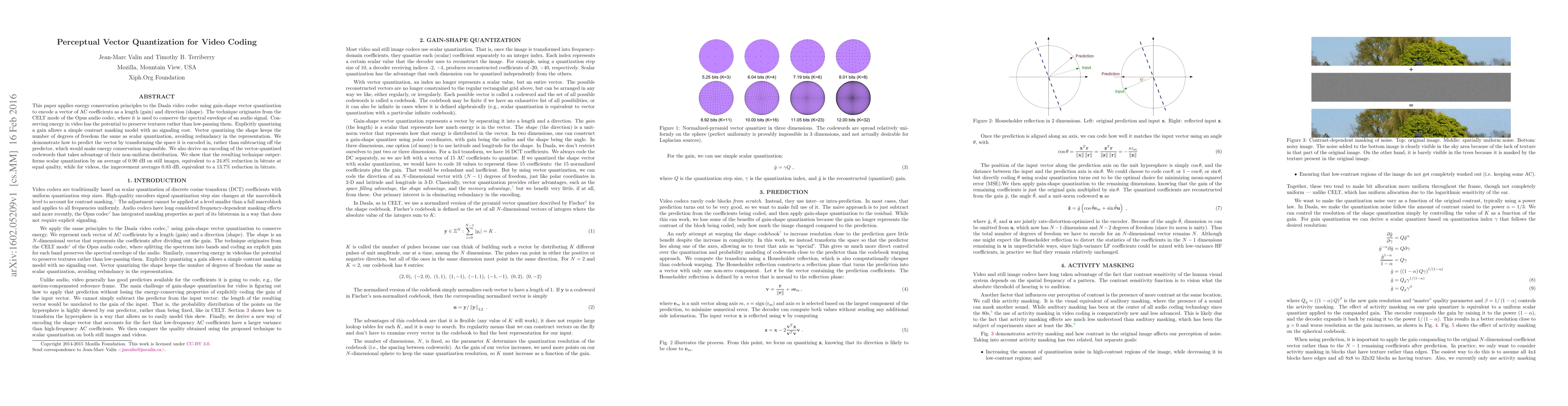 This paper introduces a perceptual vector quantization technique for the Daala video codec, leveraging energy conservation principles to improve texture preservation. The method outperforms scalar quantization by reducing bitrates while maintaining or improving image quality.