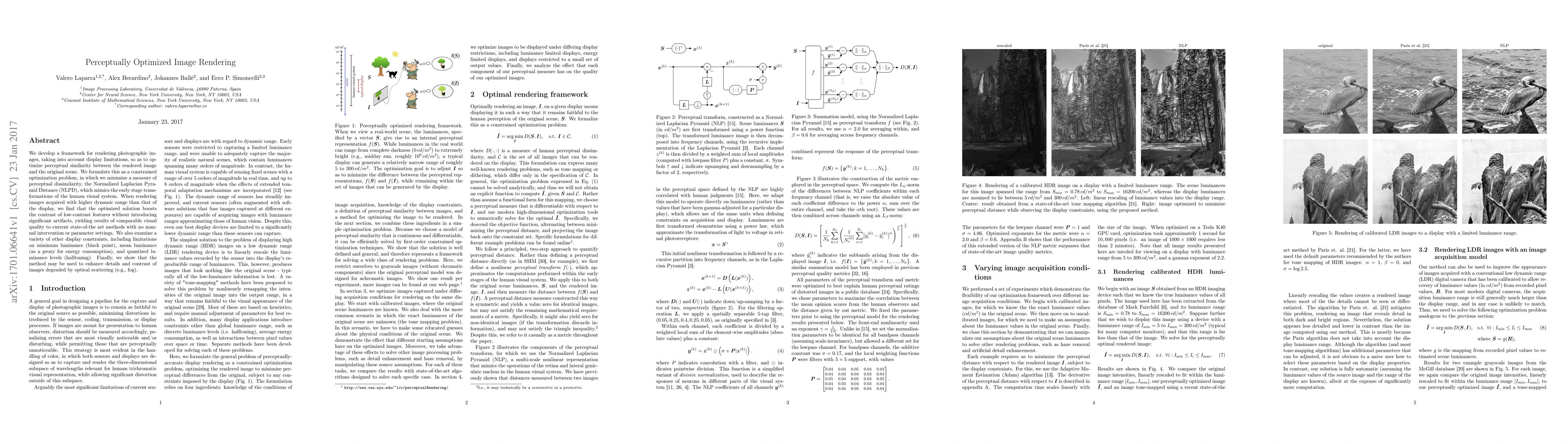 We develop a framework for rendering photographic images, taking into account display limitations, so as to optimize perceptual similarity between the rendered image and the original scene. We formulate this as a constrained optimization problem, in which we minimize a measure of perceptual dissimilarity, the Normalized Laplacian Pyramid Distance (NLPD), which mimics the early stage transformations of the human visual system. When rendering images acquired with higher dynamic range than that of the display, we find that the optimized solution boosts the contrast of low-contrast features without introducing significant artifacts, yielding results of comparable visual quality to current state-of-the art methods with no manual intervention or parameter settings. We also examine a variety of other display constraints, including limitations on minimum luminance (black point), mean luminance (as a proxy for energy consumption), and quantized luminance levels (halftoning). Finally, we show that the method may be used to enhance details and contrast of images degraded by optical scattering (e.g. fog).