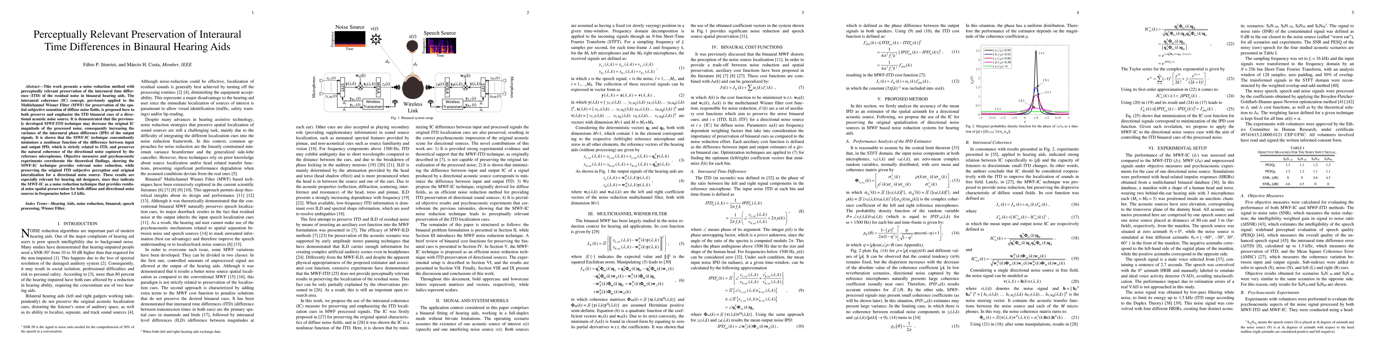This study proposes a noise reduction method in binaural hearing aids that preserves the interaural time difference (ITD) of residual noise, using the interaural coherence (IC) concept to maintain spatial perception. The MWF-IC technique effectively reduces noise while maintaining the original ITD and lateralization, crucial for hearing aid performance.