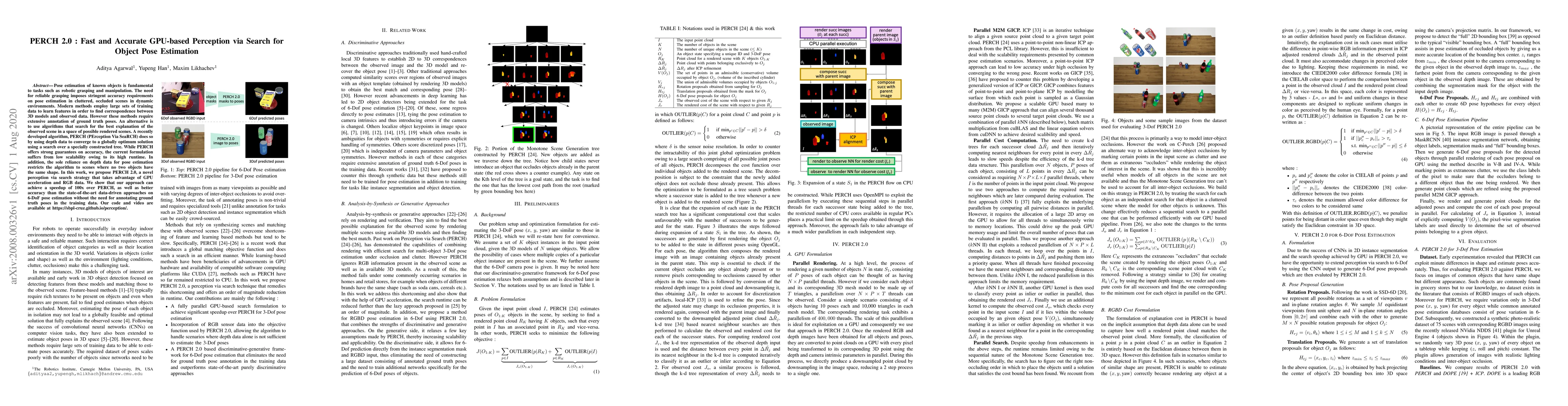PERCH 2.0 presents a GPU-accelerated, RGB-based perception via search strategy for object pose estimation, which significantly improves runtime and maintains or improves accuracy compared to existing methods.