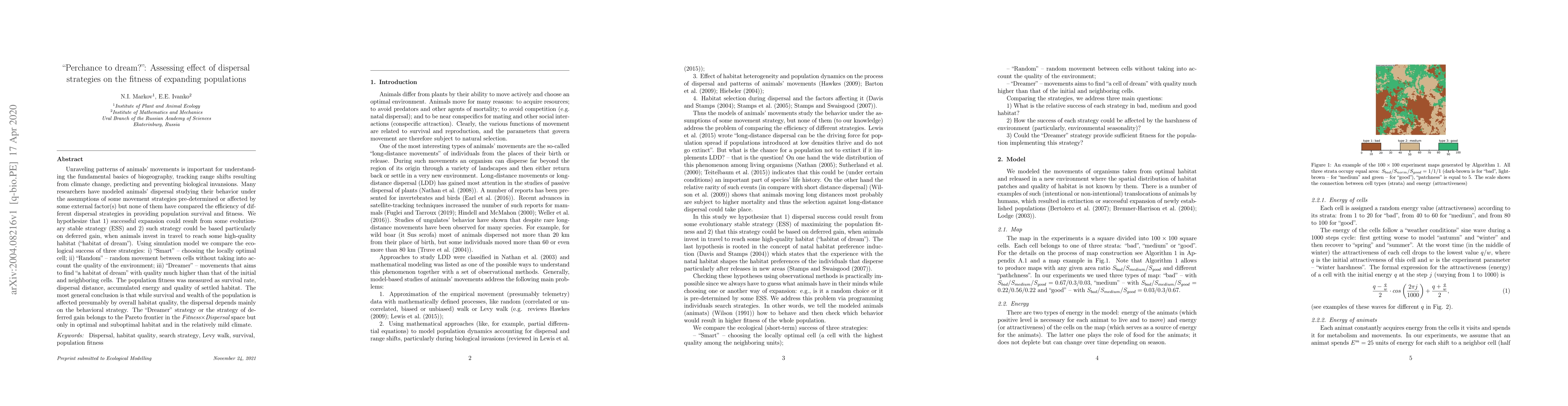 Unraveling patterns of animals' movements is important for understanding the fundamental basics of biogeography, tracking range shifts resulting from climate change, predicting and preventing biological invansions. Many researchers have modeled animals' dispersal studying their behavior under the assumptions of some movement strategies pre-determined or affected by some external factor(s) but none of them have compared the efficiency of different dispersal strategies in providing population survival and fitness. We hypothesize that 1) successful expansion could result from some evolutionary stable strategy (ESS) and 2) such strategy could be based particularly on deferred gain, when animals invest in travel to reach some high-quality habitat ("habitat of dream"). Using simulation model we compare the ecological success of three strategies: i) "Smart" - choosing the locally optimal cell; ii) "Random" - random movement between cells without taking into account the quality of the environment; iii) "Dreamer" - movements that aims to find "a habitat of dream" with quality much higher than that of the initial and neighboring cells. The population fitness was measured as survival rate, dispersal distance, accumulated energy and quality of settled habitat. The most general conclusion is that while survival and wealth of the population is affected presumably by overall habitat quality, the dispersal depends mainly on the behavioral strategy. The "Dreamer" strategy or the strategy of deferred gain belongs to the Pareto frontier in the Fitness$\times$Dispersal space but only in optimal and suboptimal habitat and in the relatively mild climate.