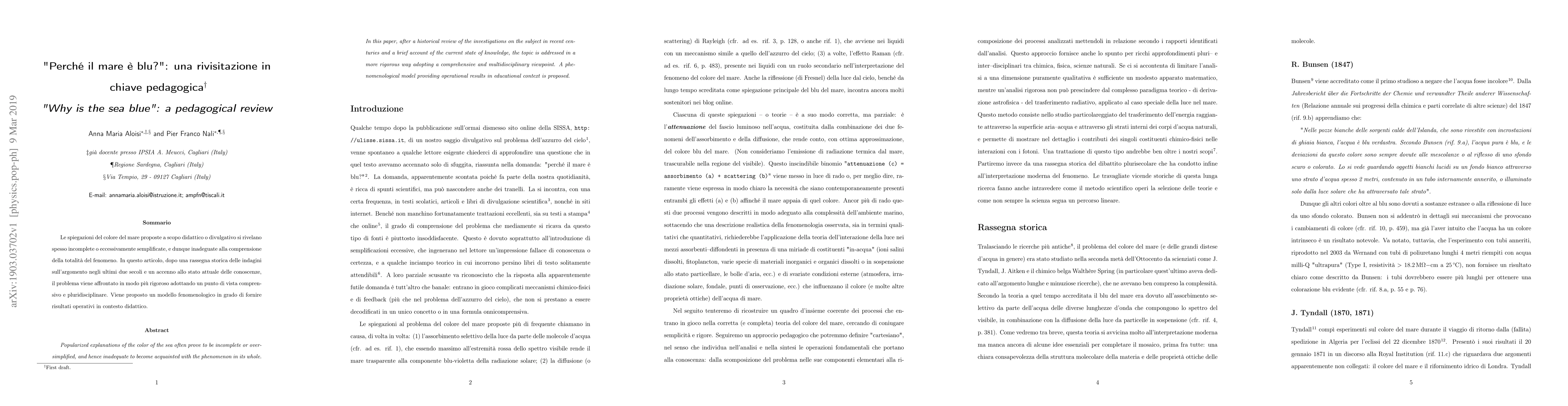 Popularized explanations of the color of the sea often prove to be incomplete or oversimplified, and hence inadequate to become acquainted with the phenomenon in its whole. In this paper, after a historical review of the investigations on the subject in recent centuries and a brief account of the current state of knowledge, the topic is addressed in a more rigorous way adopting a comprehensive and multidisciplinary viewpoint. A phenomenological model providing operational results in educational context is proposed. --- Le spiegazioni del colore del mare proposte a scopo didattico o divulgativo si rivelano spesso incomplete o eccessivamente semplificate, e dunque inadeguate alla comprensione della totalit\`a del fenomeno. In questo articolo, dopo una rassegna storica delle indagini sull'argomento negli ultimi due secoli e un accenno allo stato attuale delle conoscenze, il problema viene affrontato in modo pi\`u rigoroso adottando un punto di vista comprensivo e pluridisciplinare. Viene proposto un modello fenomenologico in grado di fornire risultati operativi in contesto didattico.