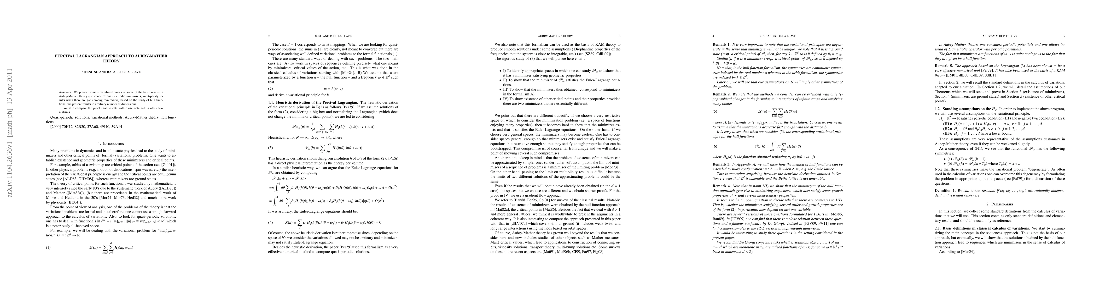 This paper utilizes the Percival Lagrangian approach to provide streamlined proofs for fundamental results in Aubry-Mather theory, including the existence of quasi-periodic minimizers and multiplicity results, in any number of dimensions. The study also compares these findings with those derived from other mathematical frameworks.