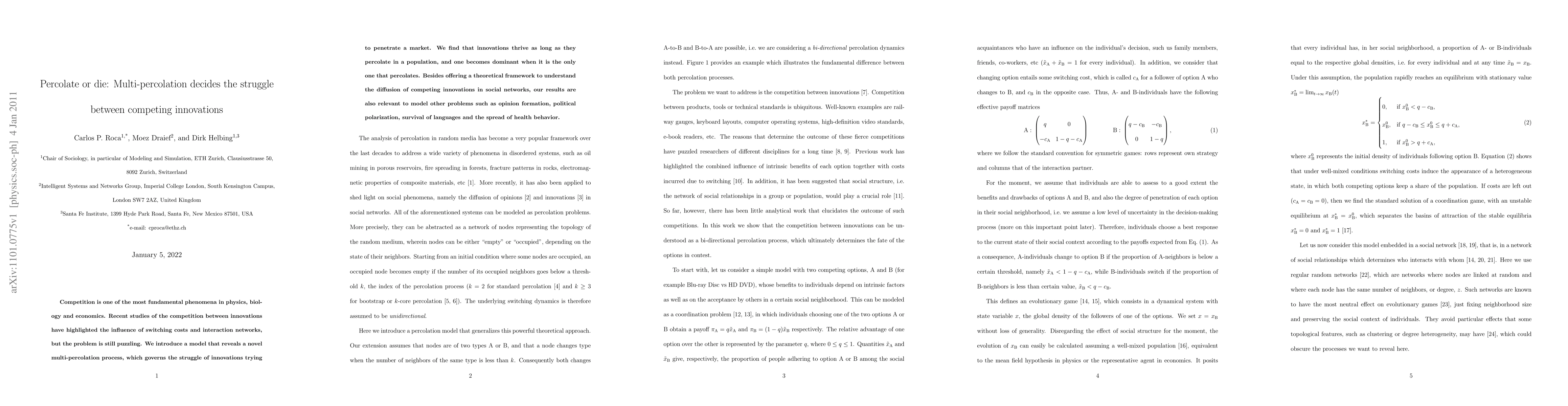 Competition is one of the most fundamental phenomena in physics, biology and economics. Recent studies of the competition between innovations have highlighted the influence of switching costs and interaction networks, but the problem is still puzzling. We introduce a model that reveals a novel multi-percolation process, which governs the struggle of innovations trying to penetrate a market. We find that innovations thrive as long as they percolate in a population, and one becomes dominant when it is the only one that percolates. Besides offering a theoretical framework to understand the diffusion of competing innovations in social networks, our results are also relevant to model other problems such as opinion formation, political polarization, survival of languages and the spread of health behavior.