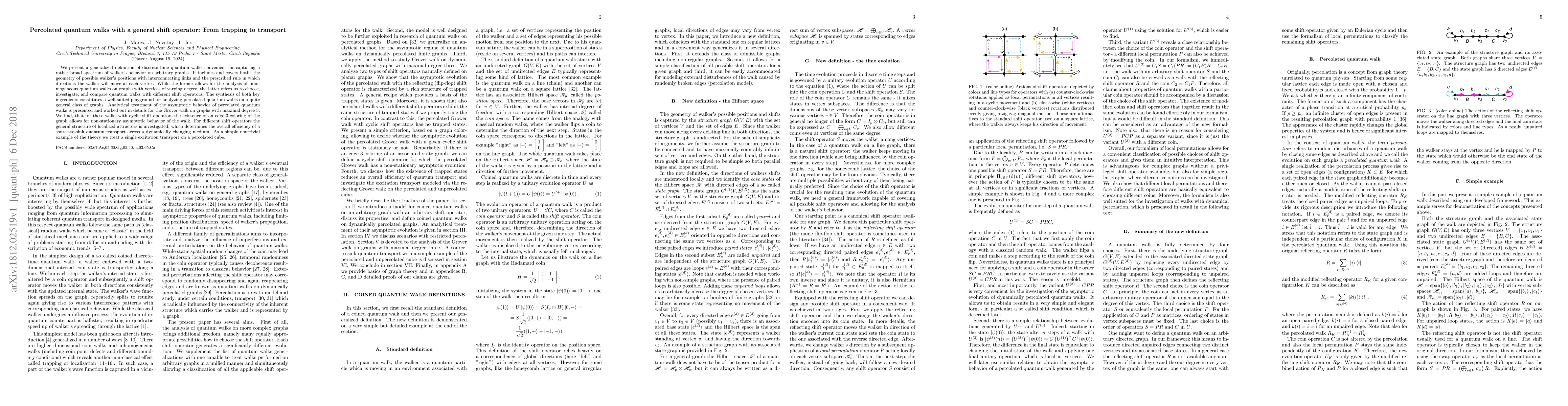 We present a generalized definition of discrete-time quantum walks convenient for capturing a rather broad spectrum of walker's behavior on arbitrary graphs. It includes and covers both: the geometry of possible walker's positions with interconnecting links and the prescribed rule in which directions the walker will move at each vertex. While the former allows for the analysis of inhomogeneous quantum walks on graphs with vertices of varying degree, the latter offers us to choose, investigate, and compare quantum walks with different shift operators. The synthesis of both key ingredients constitutes a well-suited playground for analyzing percolated quantum walks on a quite general class of graphs. Analytical treatment of the asymptotic behavior of percolated quantum walks is presented and worked out in details for the Grover walk on graphs with maximal degree 3. We find, that for these walks with cyclic shift operators the existence of an edge-3-coloring of the graph allows for non-stationary asymptotic behavior of the walk. For different shift operators the general structure of localized attractors is investigated, which determines the overall efficiency of a source-to-sink quantum transport across a dynamically changing medium. As a simple nontrivial example of the theory we treat a single excitation transport on a percolated cube.