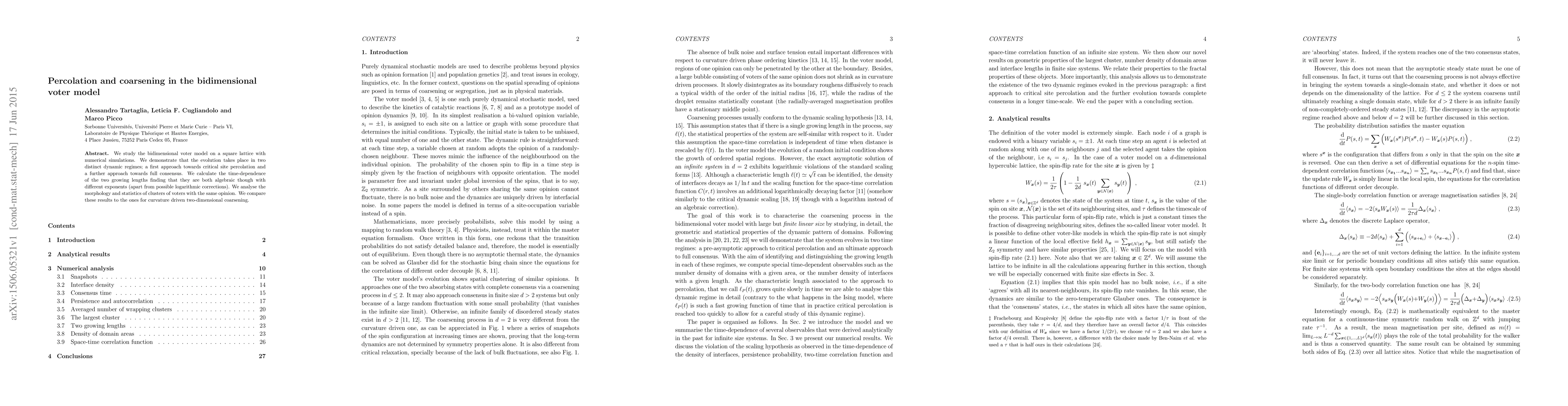 This paper investigates the bidimensional voter model on a square lattice, revealing two dynamic regimes: an initial critical site percolation phase followed by a full consensus phase. The study finds that the growing lengths exhibit algebraic time-dependence with different exponents and analyzes the cluster morphology and statistics, comparing these findings to curvature-driven coarsening processes.