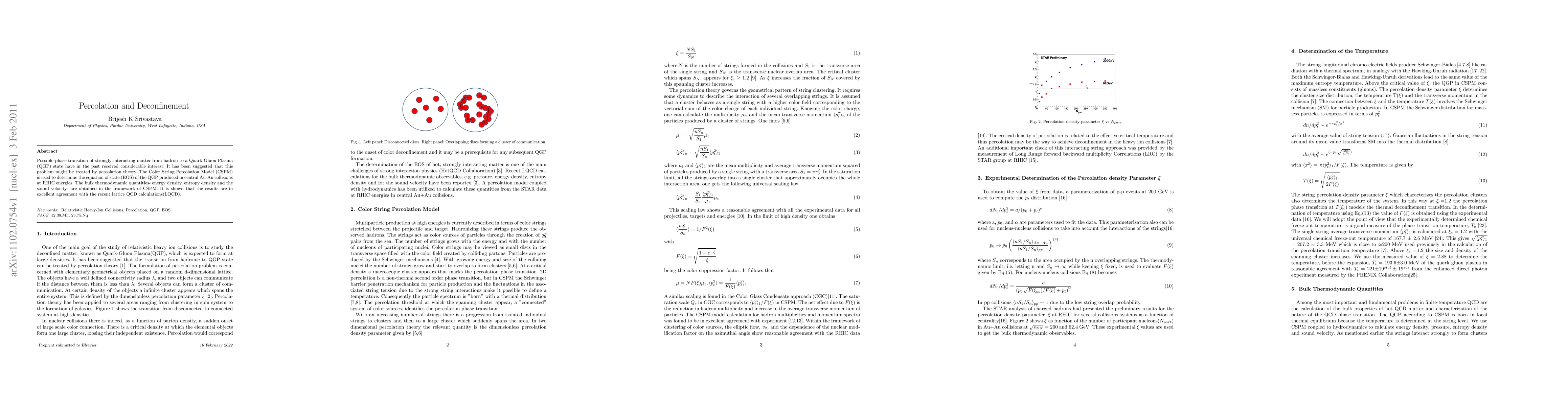 This paper explores the phase transition from hadron to Quark-Gluon Plasma (QGP) using the Color String Percolation Model (CSPM), finding excellent agreement between CSPM-derived thermodynamic quantities and recent lattice QCD calculations. The study suggests that percolation theory can effectively describe the properties of strongly interacting matter at RHIC energies.