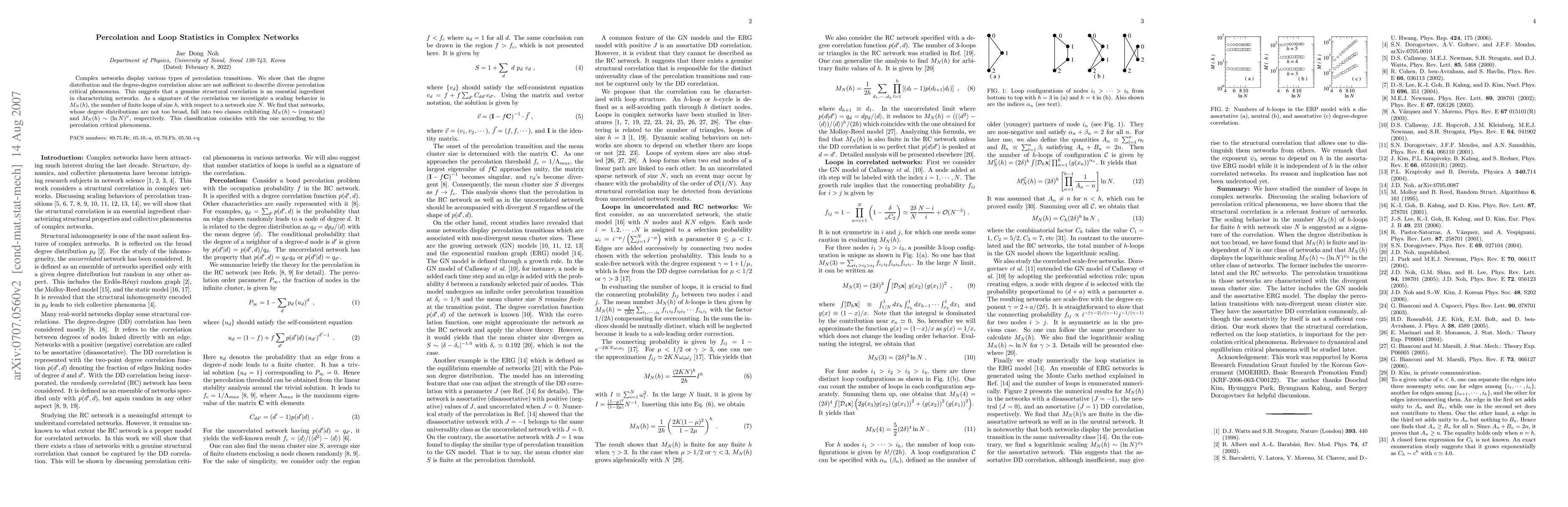 Complex networks display various types of percolation transitions. We show that the degree distribution and the degree-degree correlation alone are not sufficient to describe diverse percolation critical phenomena. This suggests that a genuine structural correlation is an essential ingredient in characterizing networks. As a signature of the correlation we investigate a scaling behavior in $M_N(h)$, the number of finite loops of size $h$, with respect to a network size $N$. We find that networks, whose degree distributions are not too broad, fall into two classes exhibiting $M_N(h)\sim ({constant})$ and $M_N(h) \sim (\ln N)^\psi$, respectively. This classification coincides with the one according to the percolation critical phenomena.