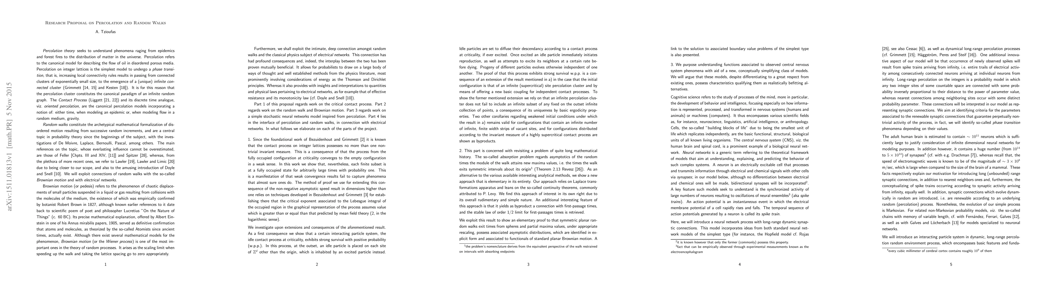 The fourfold research proposal regards in particular: critical oriented percolation; random walk limit laws; neural networks with long-range connections; the ant in a labyrinth.