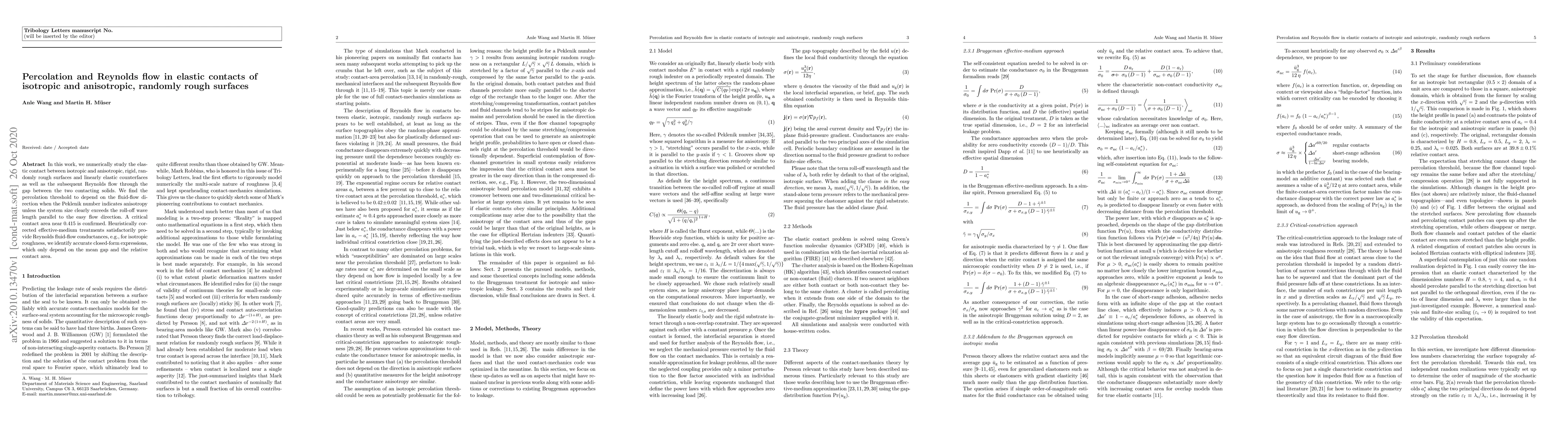 Researchers studied how fluids flow through gaps between rough surfaces, finding a critical contact area of 0.415 and accurate formulas for fluid flow conductance in isotropic cases.