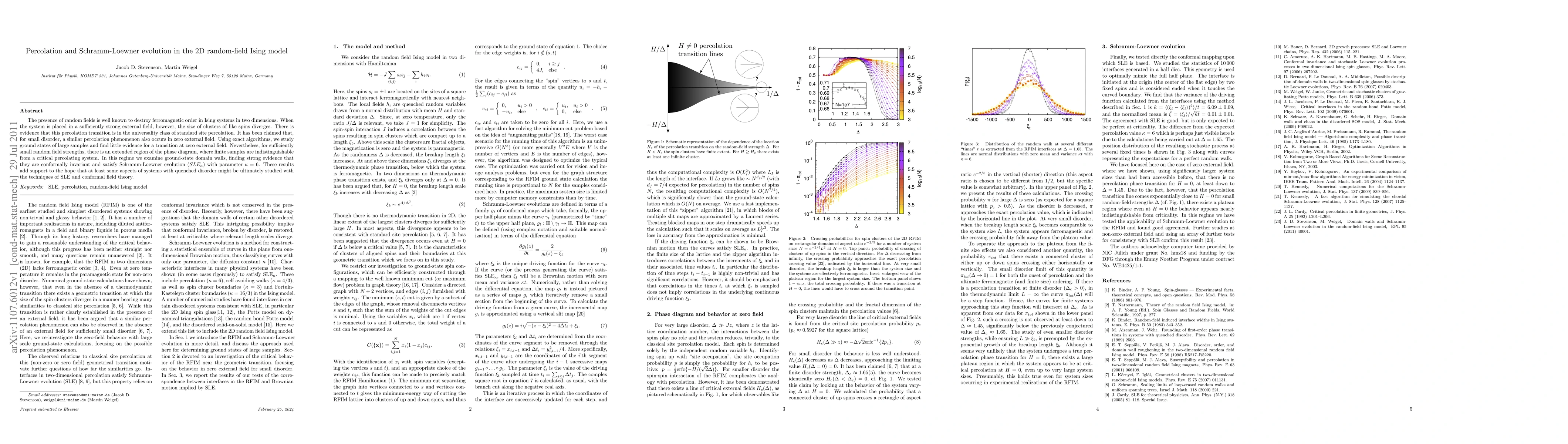 This work extends previous studies by providing numerical evidence for the absence of a percolation transition at H=0 for small disorder and demonstrating conformal invariance and SLE behavior of domain walls in a plateau region, suggesting potential connections to conformal field theory.
