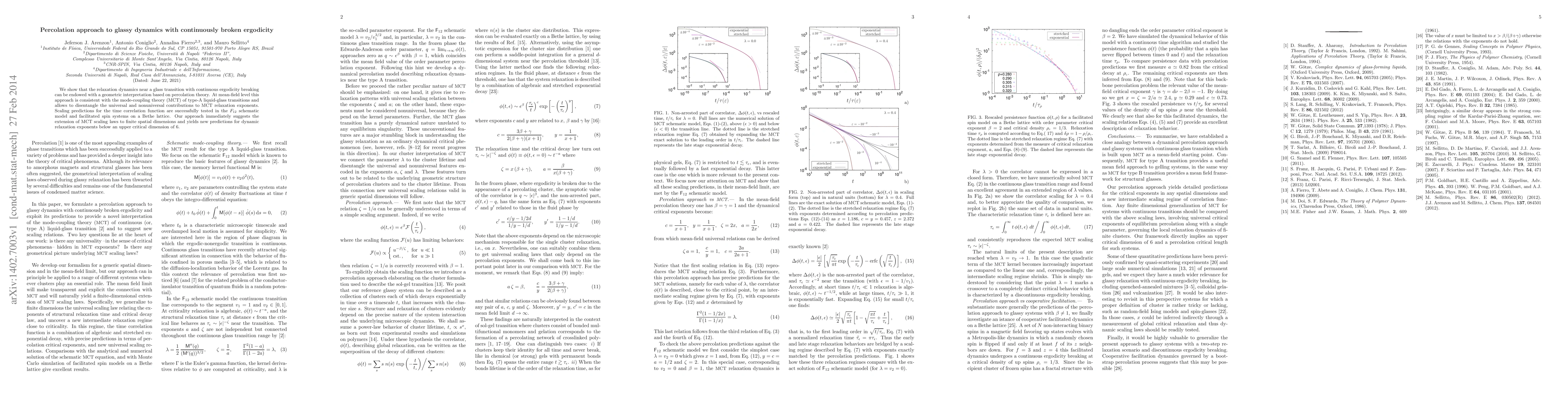 We show that the relaxation dynamics near a glass transition with continuous ergodicity breaking can be endowed with a geometric interpretation based on percolation theory. At mean-field level this approach is consistent with the mode-coupling theory (MCT) of type-A liquid-glass transitions and allows to disentangle the universal and nonuniversal contributions to MCT relaxation exponents. Scaling predictions for the time correlation function are successfully tested in the F12 schematic model and facilitated spin systems on a Bethe lattice. Our approach immediately suggests the extension of MCT scaling laws to finite spatial dimensions and yields new predictions for dynamic relaxation exponents below an upper critical dimension of 6.