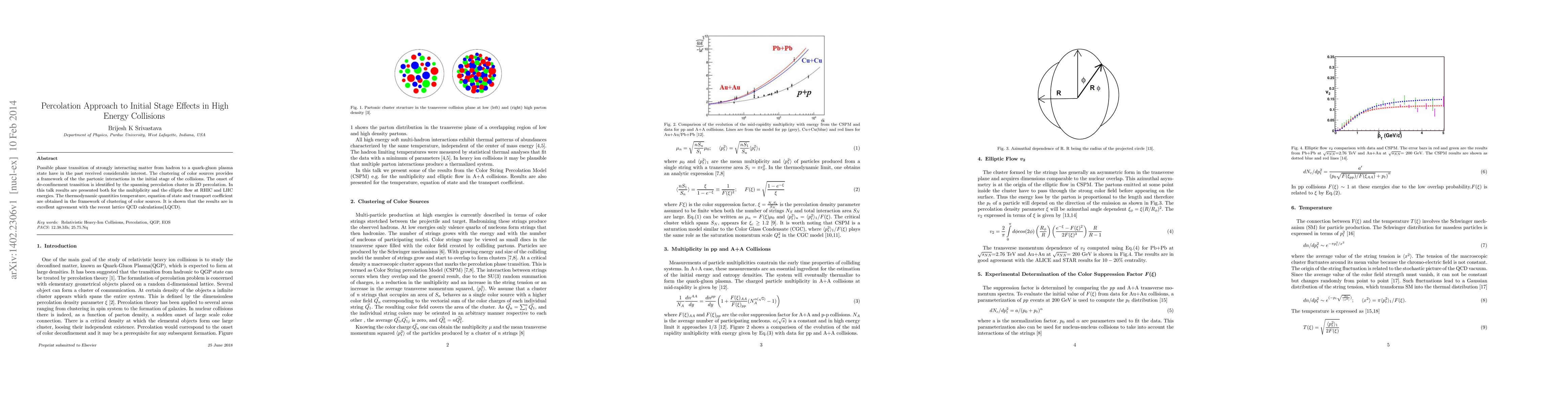Possible phase transition of strongly interacting matter from hadron to a quark-gluon plasma state have in the past received considerable interest. The clustering of color sources provides a framework of the the partonic interactions in the initial stage of the collisions. The onset of de-confinement transition is identified by the spanning percolation cluster in 2D percolation. In this talk results are presented both for the multiplicity and the elliptic flow at RHIC and LHC energies. The thermodynamic quantities temperature, equation of state and transport coefficient are obtained in the framework of clustering of color sources. It is shown that the results are in excellent agreement with the recent lattice QCD calculations(LQCD).