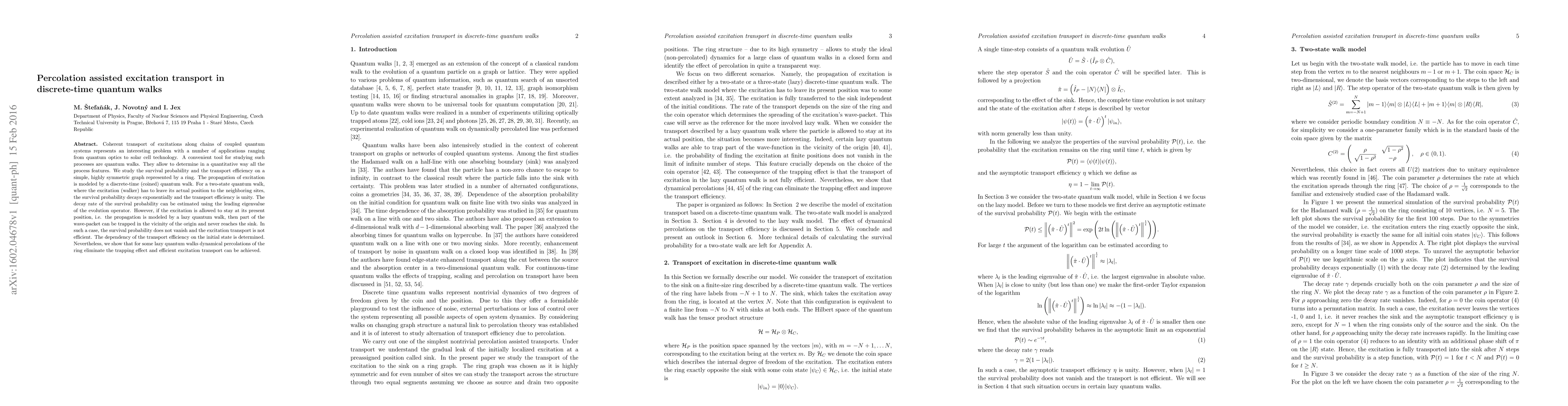 Coherent transport of excitations along chains of coupled quantum systems represents an interesting problem with a number of applications ranging from quantum optics to solar cell technology. A convenient tool for studying such processes are quantum walks. They allow to determine in a quantitative way all the process features. We study the survival probability and the transport efficiency on a simple, highly symmetric graph represented by a ring. The propagation of excitation is modeled by a discrete-time (coined) quantum walk. For a two-state quantum walk, where the excitation (walker) has to leave its actual position to the neighboring sites, the survival probability decays exponentially and the transport efficiency is unity. The decay rate of the survival probability can be estimated using the leading eigenvalue of the evolution operator. However, if the excitation is allowed to stay at its present position, i.e. the propagation is modeled by a lazy quantum walk, then part of the wave-packet can be trapped in the vicinity of the origin and never reaches the sink. In such a case, the survival probability does not vanish and the excitation transport is not efficient. The dependency of the transport efficiency on the initial state is determined. Nevertheless, we show that for some lazy quantum walks dynamical percolations of the ring eliminate the trapping effect and efficient excitation transport can be achieved.