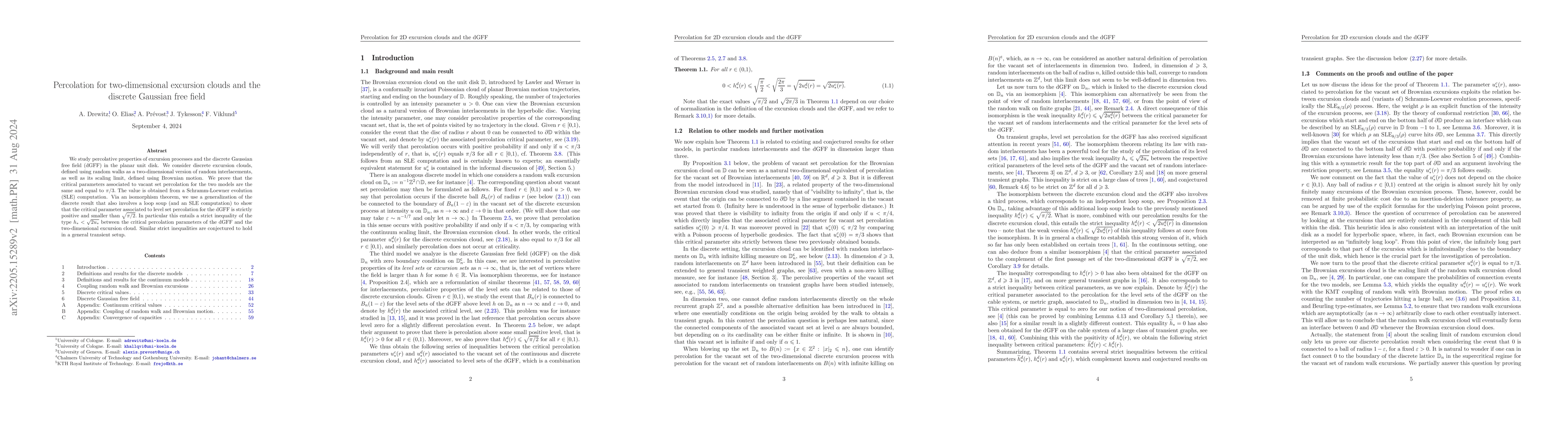 The paper studies percolative properties of two-dimensional excursion clouds and discrete Gaussian free field in a planar unit disk, finding that their critical parameters for vacant set percolation are the same as $rac{ ext{µ}}{3}$, but with different inequalities for level set percolation.