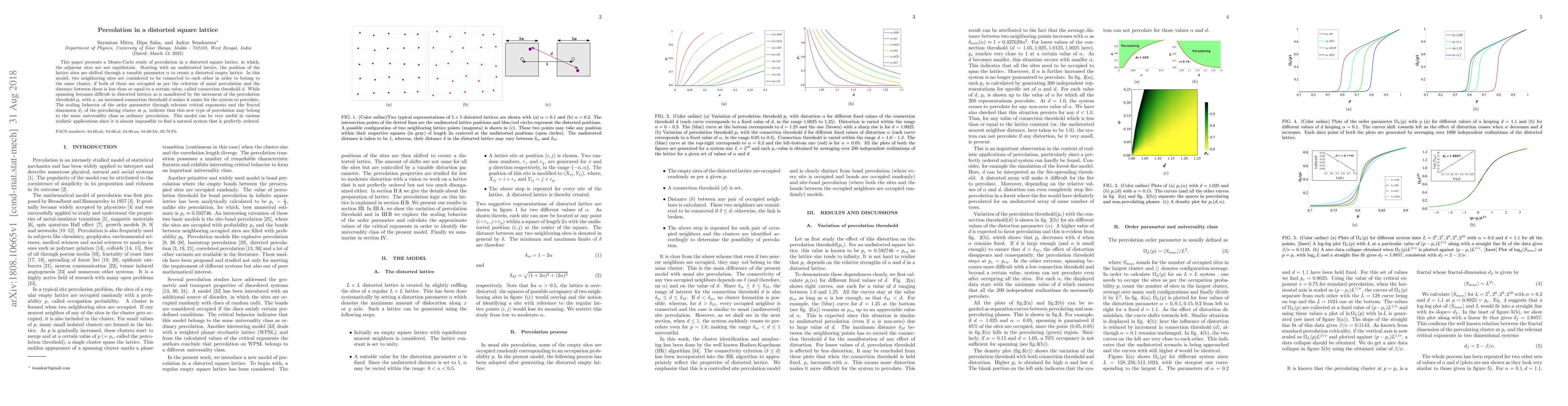 This paper investigates percolation in a distorted square lattice using Monte-Carlo simulations, where site distances vary and connectivity depends on both occupation and distance. The study finds that while increased lattice distortion raises the percolation threshold, higher connection thresholds facilitate percolation, suggesting a potential universality class similar to ordinary percolation.