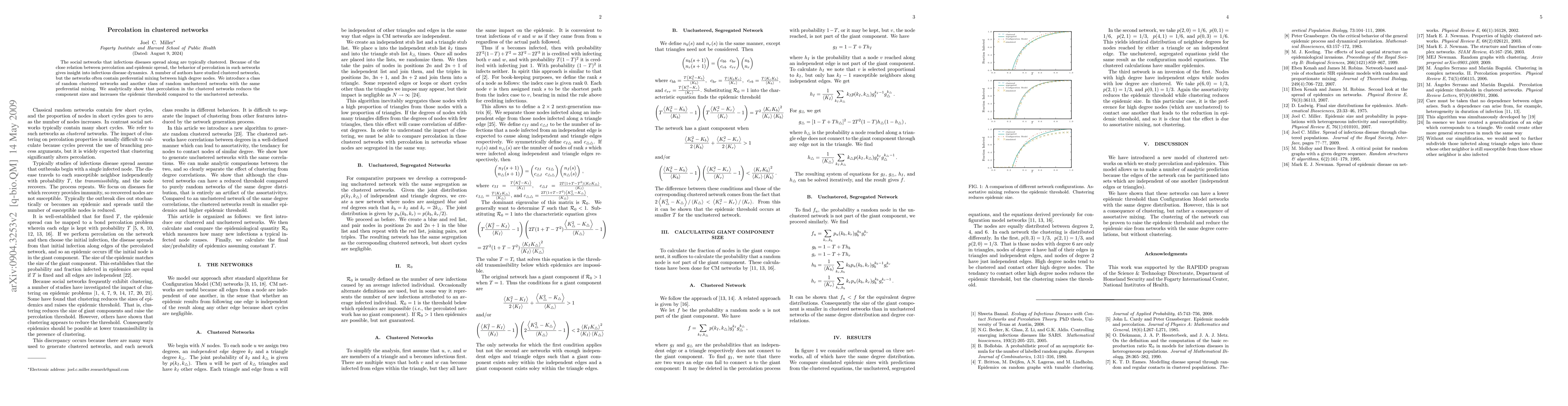 This paper investigates percolation behavior in clustered versus unclustered networks, showing that clustered networks reduce component sizes and increase the epidemic threshold compared to unclustered networks with the same preferential mixing. The findings provide insight into the dynamics of infectious disease spread in social networks.
