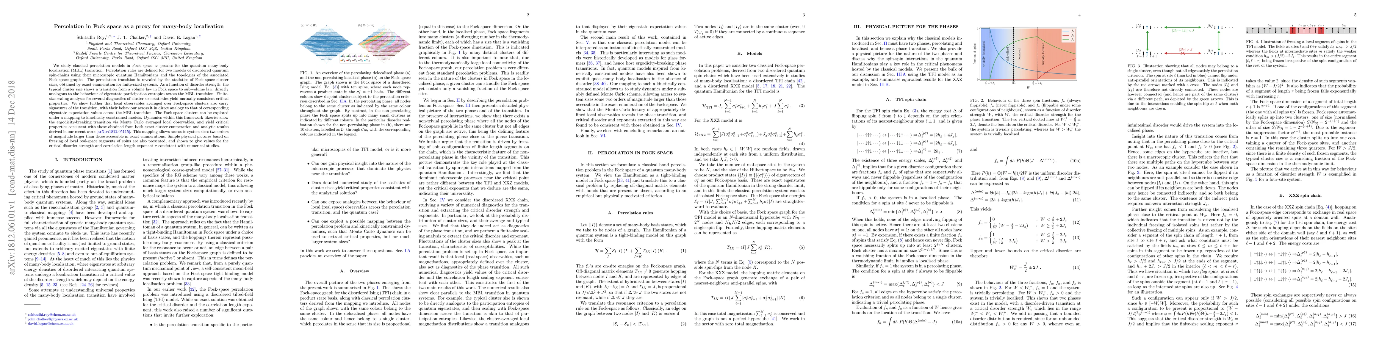 This paper investigates classical percolation models in Fock space as proxies for the quantum many-body localisation transition, revealing a transition from volume to sub-volume law in cluster sizes analogous to the MBL transition. The study uses exact enumeration and finite-size scaling to identify critical properties and mapping to kinetically constrained models to extend the analysis to larger systems.