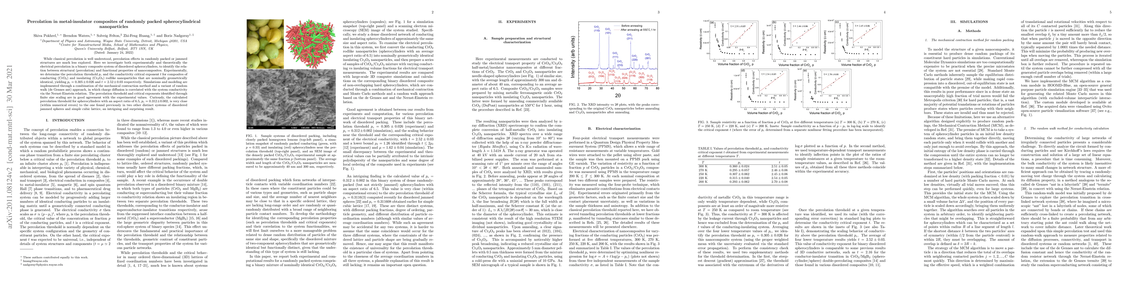 While classical percolation is well understood, percolation effects in randomly packed or jammed structures are much less explored. Here we investigate both experimentally and theoretically the electrical percolation in a binary composite system of disordered spherocylinders, to identify the relation between structural (percolation) and functional properties of nanocomposites. Experimentally, we determine the percolation threshold $p_c$ and the conductivity critical exponent $t$ for composites of conducting (CrO$_2$) and insulating (Cr$_2$O$_3$) rodlike nanoparticles that are nominally geometrically identical, yielding $p_c=0.305 \pm 0.026$ and $t=2.52 \pm 0.03$ respectively. Simulations and modeling are implemented through a combination of the mechanical contraction method and a variant of random walk (de Gennes ant) approach, in which charge diffusion is correlated with the system conductivity via the Nernst-Einstein relation. The percolation threshold and critical exponents identified through finite size scaling are in good agreement with the experimental values. Curiously, the calculated percolation threshold for spherocylinders with an aspect ratio of 6.5, $p_c=0.312 \pm 0.002$, is very close (within numerical errors) to the one found previously in two other distinct systems of disordered jammed spheres and simple cubic lattice, an intriguing and surprising result.