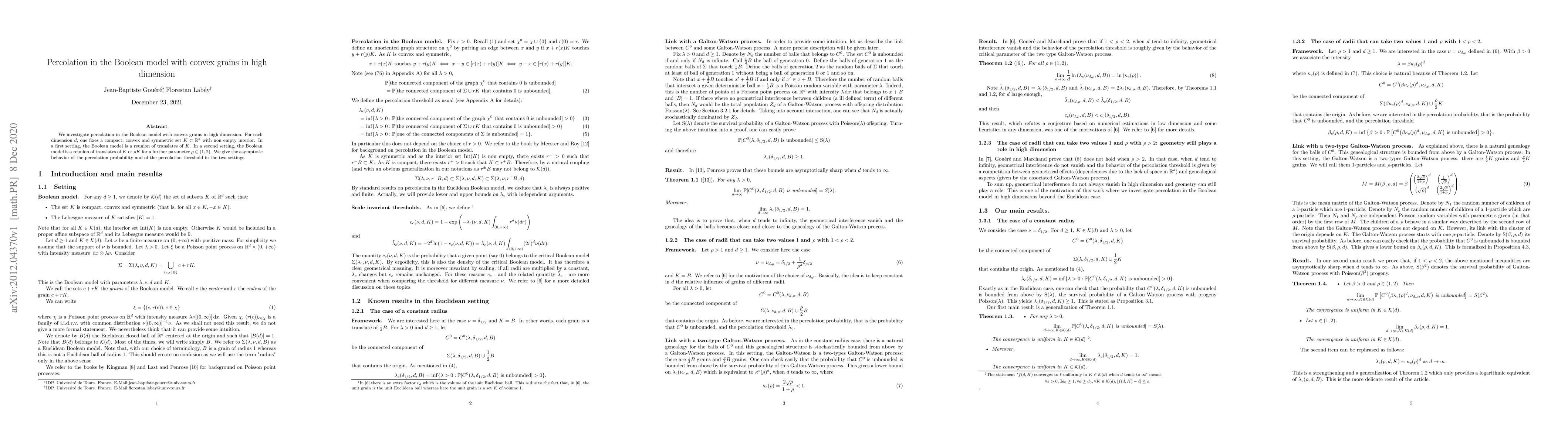 This paper studies percolation in the Boolean model with convex grains in high dimensions, analyzing two settings: one with translates of a fixed convex set K and another with both K and scaled versions $\rho$K. It provides insights into the asymptotic behavior of percolation probability and threshold.