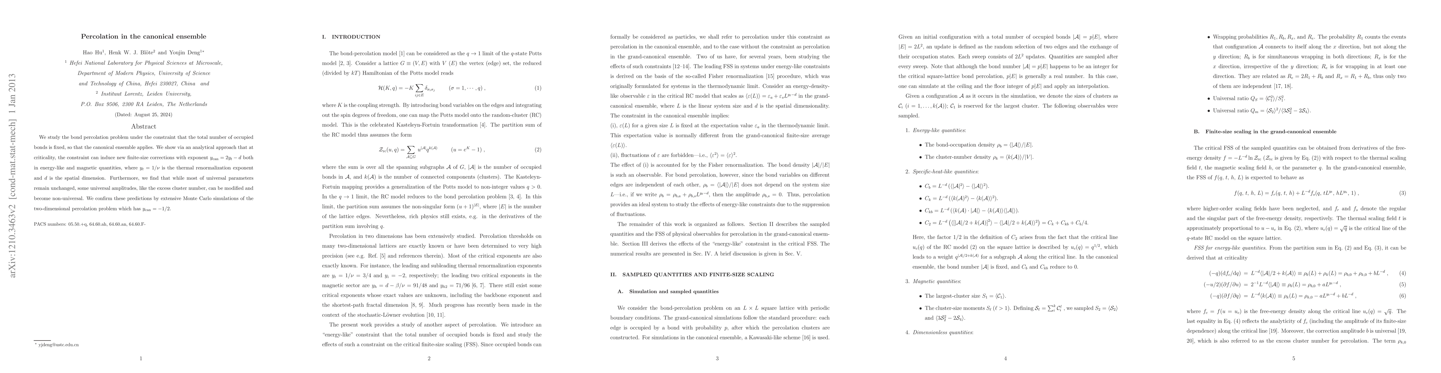 This paper investigates bond percolation in the canonical ensemble, revealing new finite-size corrections at criticality with an exponent y_{can}=2y_t-d. It shows that while most universal parameters stay the same, some, like the excess cluster number, can change, confirmed by Monte Carlo simulations in two dimensions.