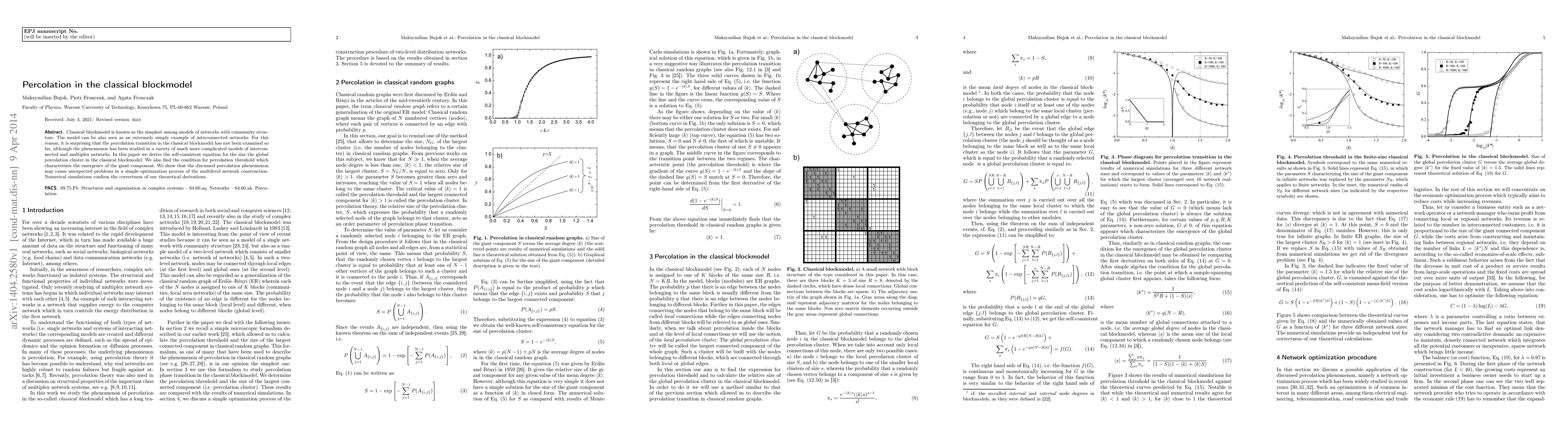 Classical blockmodel is known as the simplest among models of networks with community structure. The model can be also seen as an extremely simply example of interconnected networks. For this reason, it is surprising that the percolation transition in the classical blockmodel has not been examined so far, although the phenomenon has been studied in a variety of much more complicated models of interconnected and multiplex networks. In this paper we derive the self-consistent equation for the size the global percolation cluster in the classical blockmodel. We also find the condition for percolation threshold which characterizes the emergence of the giant component. We show that the discussed percolation phenomenon may cause unexpected problems in a simple optimization process of the multilevel network construction. Numerical simulations confirm the correctness of our theoretical derivations.