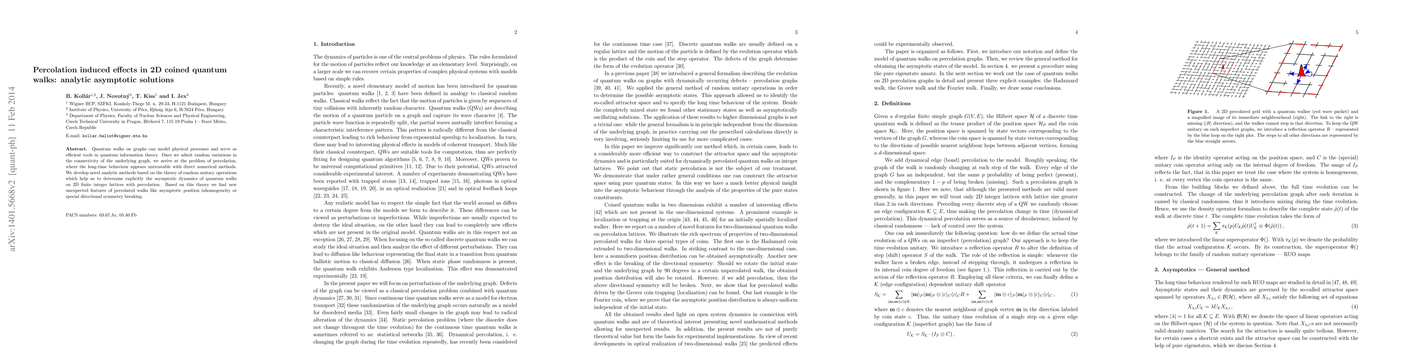 This paper develops novel analytic methods to determine the asymptotic dynamics of quantum walks on 2D lattices under percolation, revealing unexpected features such as position inhomogeneity and directional symmetry breaking. These findings provide insights into the long-time behavior of quantum walks in percolated environments.