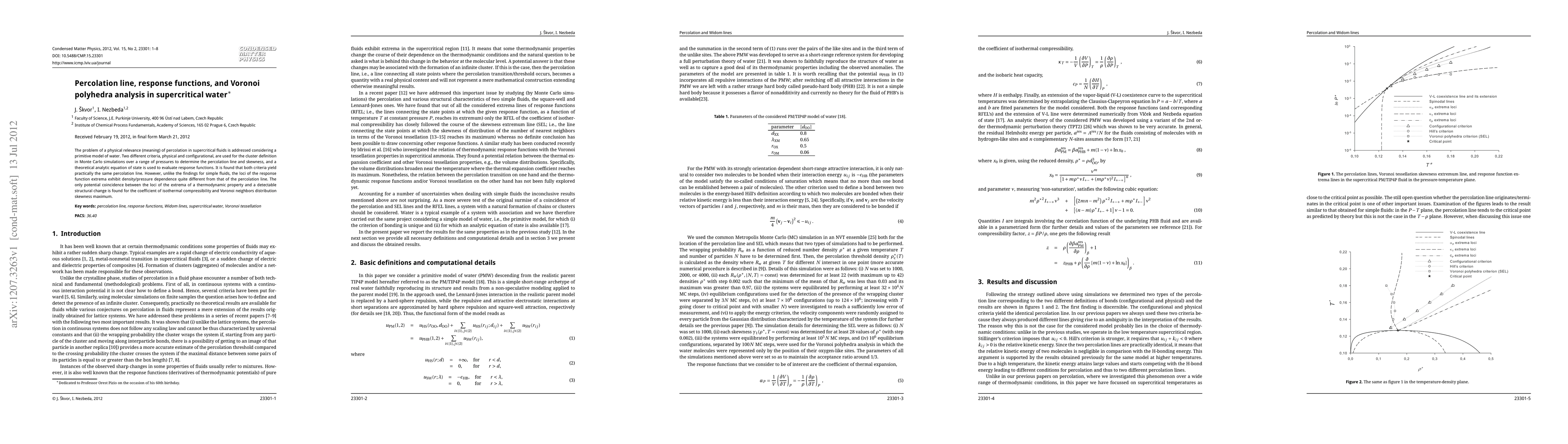 This paper investigates percolation in supercritical water using Monte Carlo simulations and finds that both physical and configurational criteria yield similar percolation lines. However, the loci of response function extrema differ from the percolation line, with a notable correlation found between the isothermal compressibility and Voronoi skewness.