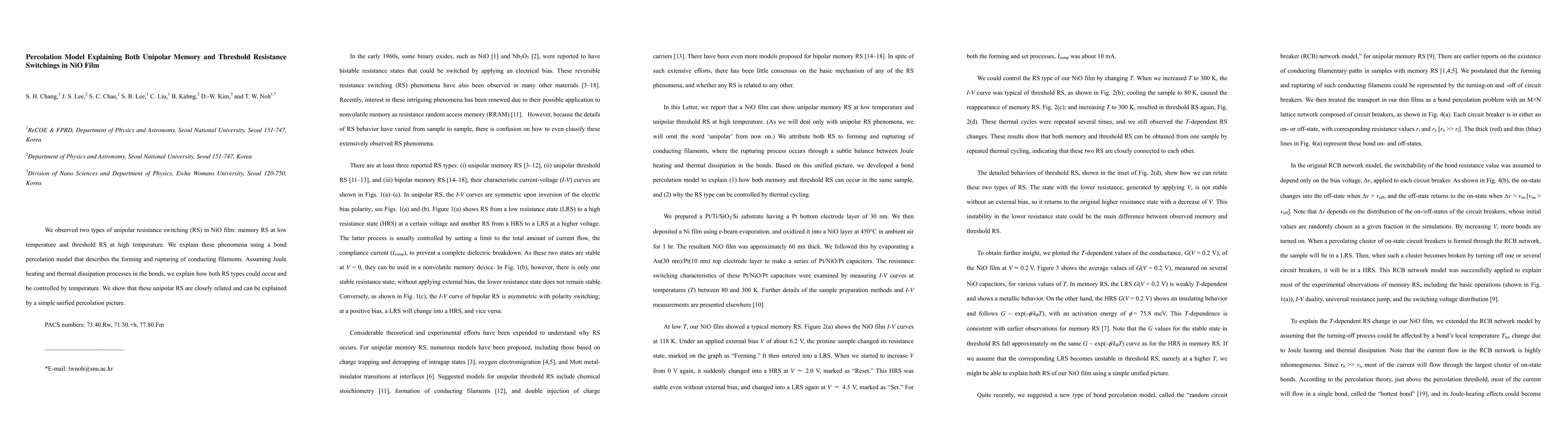 This study investigates unipolar resistance switching in NiO film, identifying memory and threshold switchings at low and high temperatures, respectively. A bond percolation model is employed to explain these phenomena through the formation and rupture of conducting filaments, highlighting their unified nature.