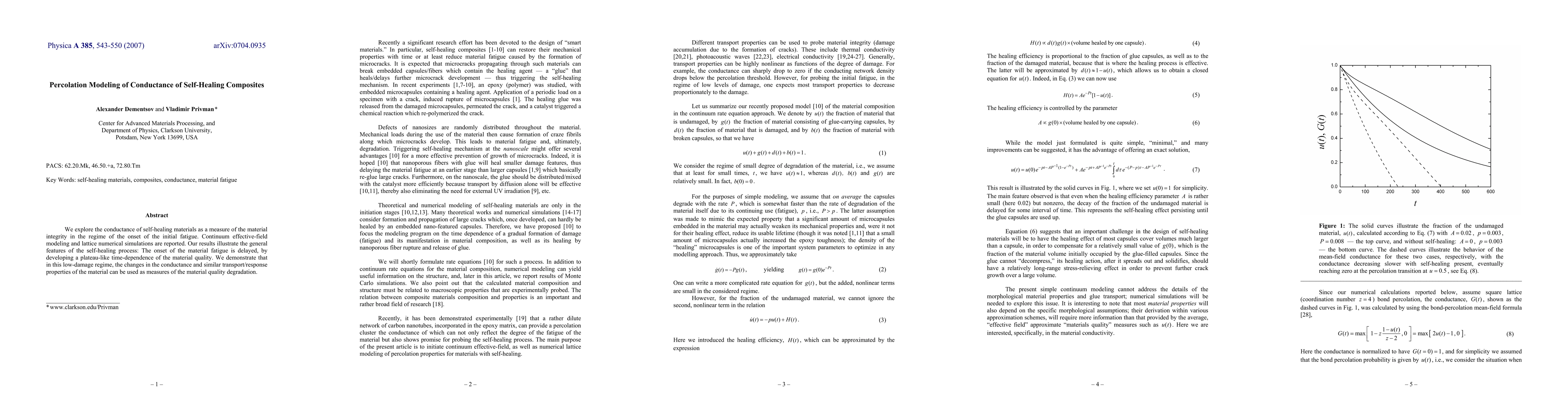 We explore the conductance of self-healing materials as a measure of the material integrity in the regime of the onset of the initial fatigue. Continuum effective-field modeling and lattice numerical simulations are reported. Our results illustrate the general features of the self-healing process: The onset of the material fatigue is delayed, by developing a plateau-like time-dependence of the material quality. We demonstrate that in this low-damage regime, the changes in the conductance and similar transport/response properties of the material can be used as measures of the material quality degradation.