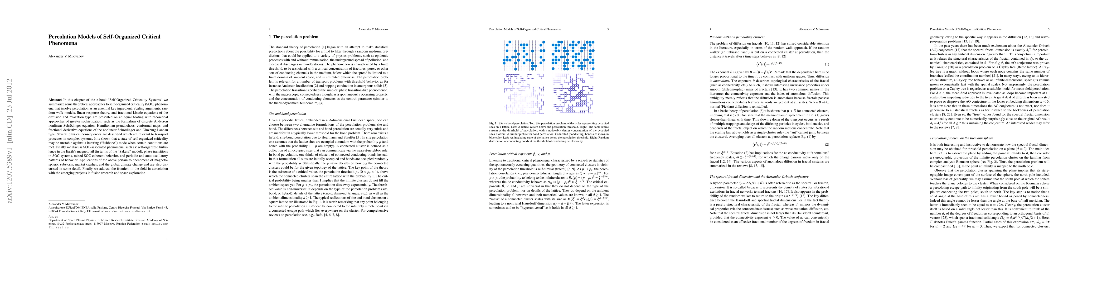 In this chapter of the e-book "Self-Organized Criticality Systems" we summarize some theoretical approaches to self-organized criticality (SOC) phenomena that involve percolation as an essential key ingredient. Scaling arguments, random walk models, linear-response theory, and fractional kinetic equations of the diffusion and relaxation type are presented on an equal footing with theoretical approaches of greater sophistication, such as the formalism of discrete Anderson nonlinear Schr\"odinger equation, Hamiltonian pseudochaos, conformal maps, and fractional derivative equations of the nonlinear Schr\"odinger and Ginzburg-Landau type. Several physical consequences are described which are relevant to transport processes in complex systems. It is shown that a state of self-organized criticality may be unstable against a bursting ("fishbone") mode when certain conditions are met. Finally we discuss SOC-associated phenomena, such as: self-organized turbulence in the Earth's magnetotail (in terms of the "Sakura" model), phase transitions in SOC systems, mixed SOC-coherent behavior, and periodic and auto-oscillatory patterns of behavior. Applications of the above pertain to phenomena of magnetospheric substorm, market crashes, and the global climate change and are also discussed in some detail. Finally we address the frontiers in the field in association with the emerging projects in fusion research and space exploration.