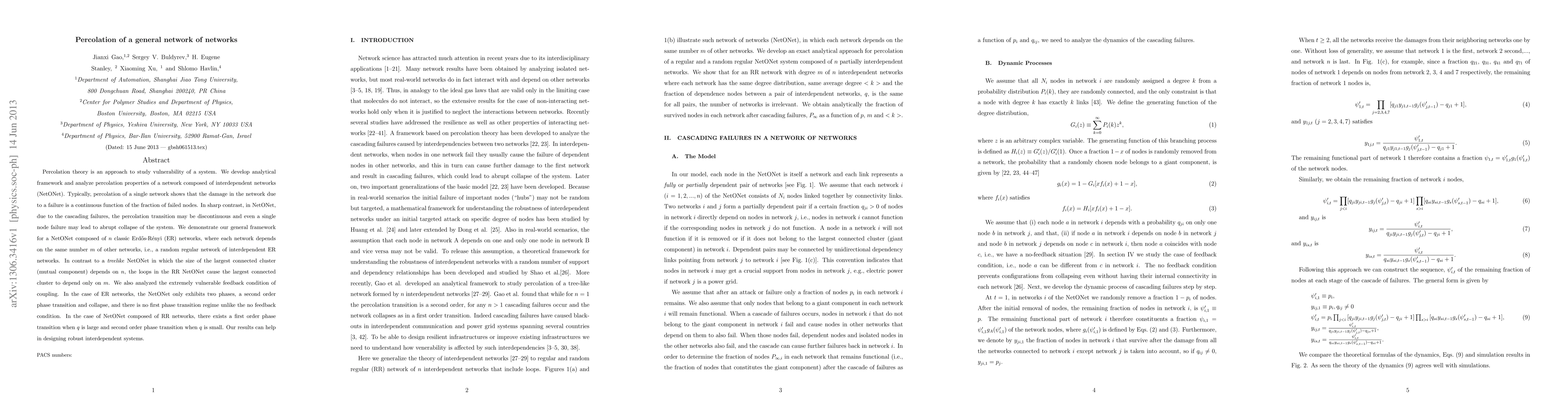 Percolation theory is an approach to study vulnerability of a system. We develop analytical framework and analyze percolation properties of a network composed of interdependent networks (NetONet). Typically, percolation of a single network shows that the damage in the network due to a failure is a continuous function of the fraction of failed nodes. In sharp contrast, in NetONet, due to the cascading failures, the percolation transition may be discontinuous and even a single node failure may lead to abrupt collapse of the system. We demonstrate our general framework for a NetONet composed of $n$ classic Erd\H{o}s-R\'{e}nyi (ER) networks, where each network depends on the same number $m$ of other networks, i.e., a random regular network of interdependent ER networks. In contrast to a \emph{treelike} NetONet in which the size of the largest connected cluster (mutual component) depends on $n$, the loops in the RR NetONet cause the largest connected cluster to depend only on $m$. We also analyzed the extremely vulnerable feedback condition of coupling. In the case of ER networks, the NetONet only exhibits two phases, a second order phase transition and collapse, and there is no first phase transition regime unlike the no feedback condition. In the case of NetONet composed of RR networks, there exists a first order phase transition when $q$ is large and second order phase transition when $q$ is small. Our results can help in designing robust interdependent systems.