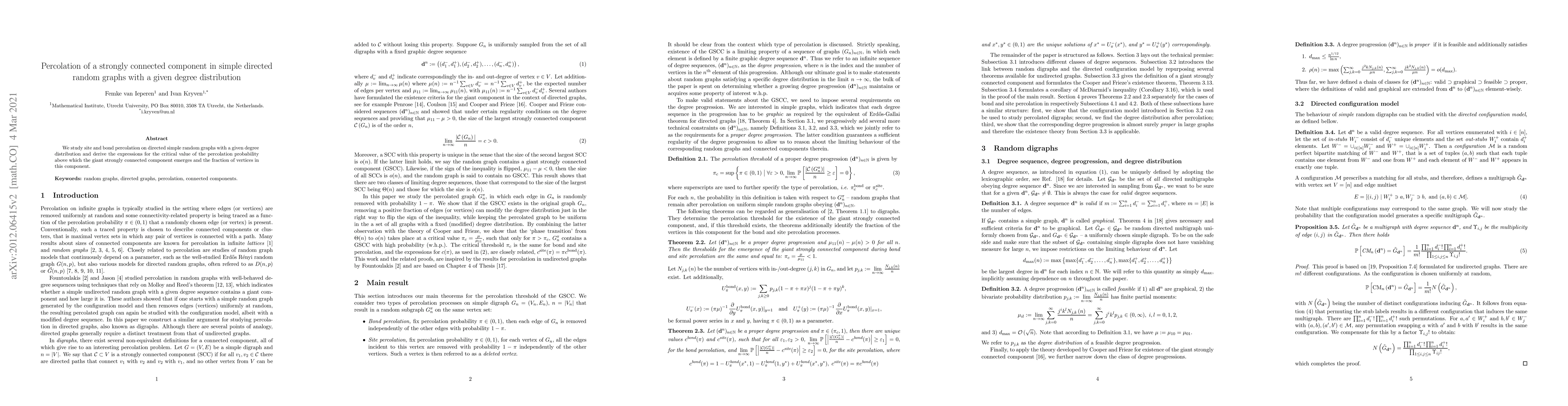 This paper investigates site and bond percolation in directed simple random graphs with a specified degree distribution, deriving the critical percolation probability for the emergence of a giant strongly connected component and its vertex fraction.