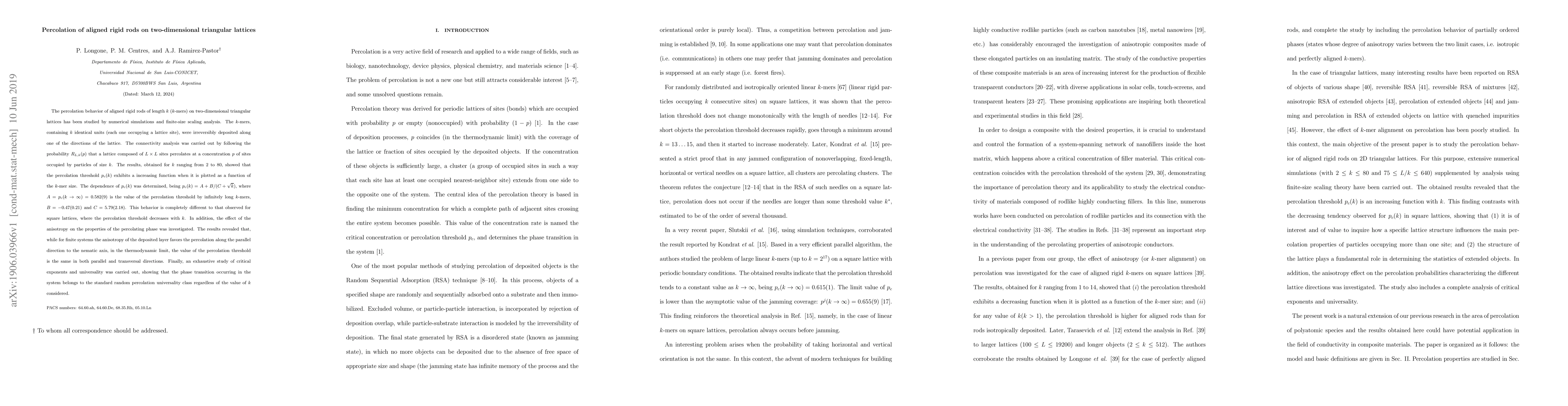 This study investigates the percolation behavior of aligned rigid rods on two-dimensional triangular lattices, revealing that the percolation threshold increases with rod size and follows the relation $p_c(k)=A+B/(C+\sqrt{k})$. The anisotropy favors percolation parallel to the rod alignment but does not affect the threshold in the thermodynamic limit. The phase transition belongs to the standard random percolation universality class.