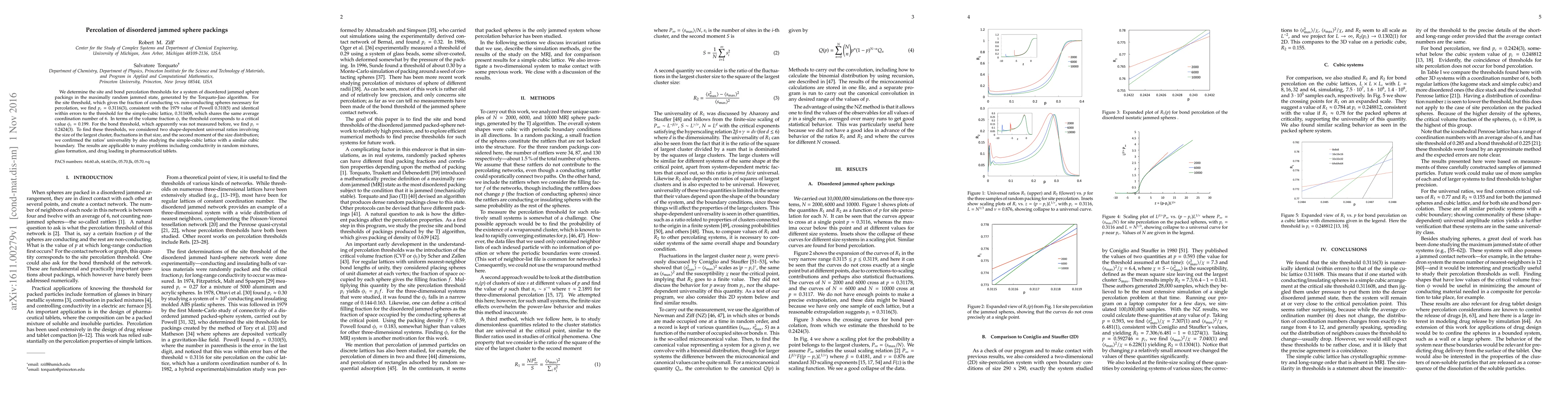 This paper determines the percolation thresholds for disordered jammed sphere packings, finding a site percolation threshold of $p_c = 0.3116(3)$ and a bond percolation threshold of $p_c = 0.2424(3)$. The results are relevant for understanding conductivity in random mixtures and other related phenomena.