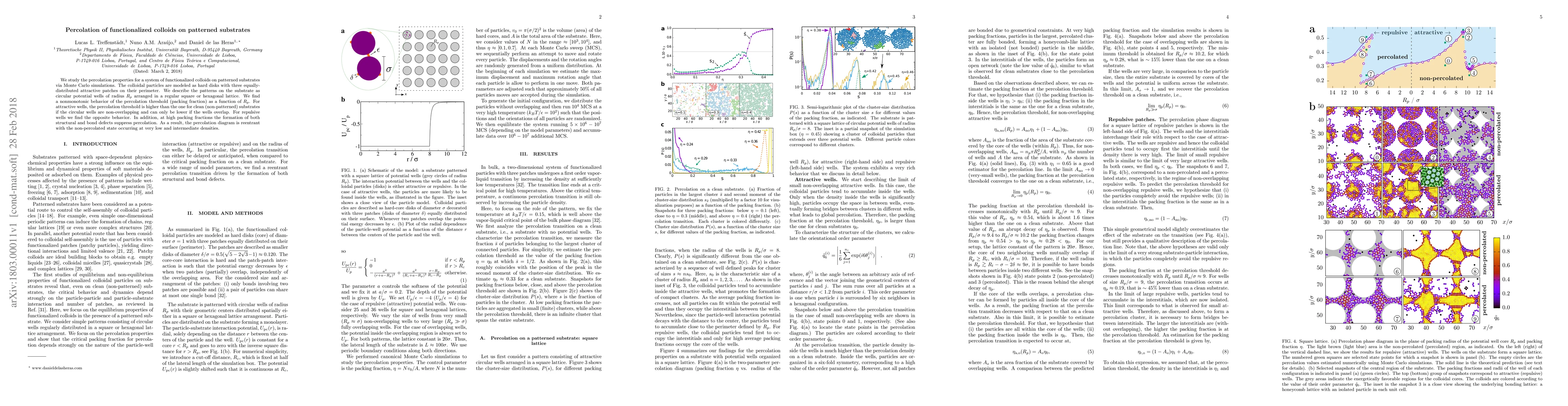 This study explores the percolation behavior of functionalized colloids on patterned substrates using Monte Carlo simulations. The research reveals a nonmonotonic percolation threshold influenced by the arrangement and overlap of circular potential wells, with distinct behaviors for attractive and repulsive wells, and a reentrant percolation diagram due to structural and bond defects.