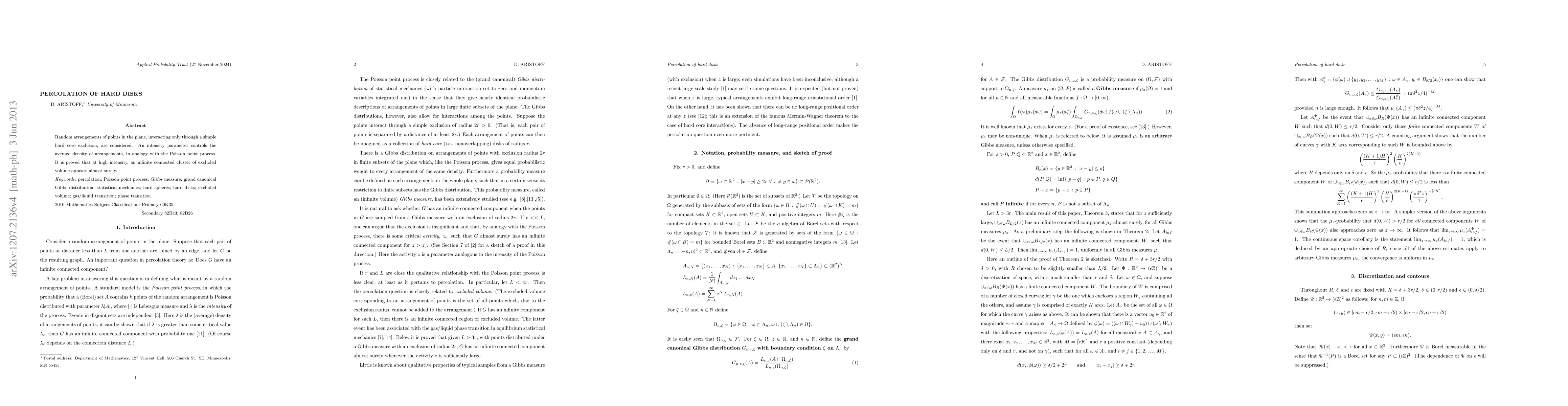 Random arrangements of points in the plane, interacting only through a simple hard core exclusion, are considered. An intensity parameter controls the average density of arrangements, in analogy with the Poisson point process. It is proved that at high intensity, an infinite connected cluster of excluded volume appears with positive probability.