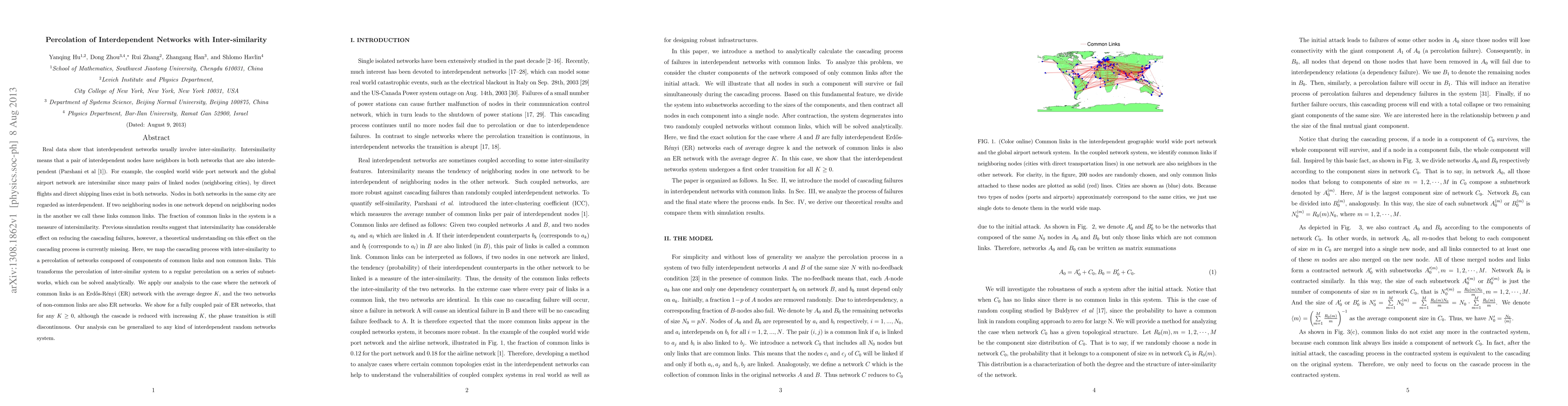 Real data show that interdependent networks usually involve inter-similarity. Intersimilarity means that a pair of interdependent nodes have neighbors in both networks that are also interdependent (Parshani et al \cite{PAR10B}). For example, the coupled world wide port network and the global airport network are intersimilar since many pairs of linked nodes (neighboring cities), by direct flights and direct shipping lines exist in both networks. Nodes in both networks in the same city are regarded as interdependent. If two neighboring nodes in one network depend on neighboring nodes in the another we call these links common links. The fraction of common links in the system is a measure of intersimilarity. Previous simulation results suggest that intersimilarity has considerable effect on reducing the cascading failures, however, a theoretical understanding on this effect on the cascading process is currently missing. Here, we map the cascading process with inter-similarity to a percolation of networks composed of components of common links and non common links. This transforms the percolation of inter-similar system to a regular percolation on a series of subnetworks, which can be solved analytically. We apply our analysis to the case where the network of common links is an Erd\H{o}s-R\'{e}nyi (ER) network with the average degree $K$, and the two networks of non-common links are also ER networks. We show for a fully coupled pair of ER networks, that for any $K\geq0$, although the cascade is reduced with increasing $K$, the phase transition is still discontinuous. Our analysis can be generalized to any kind of interdependent random networks system.