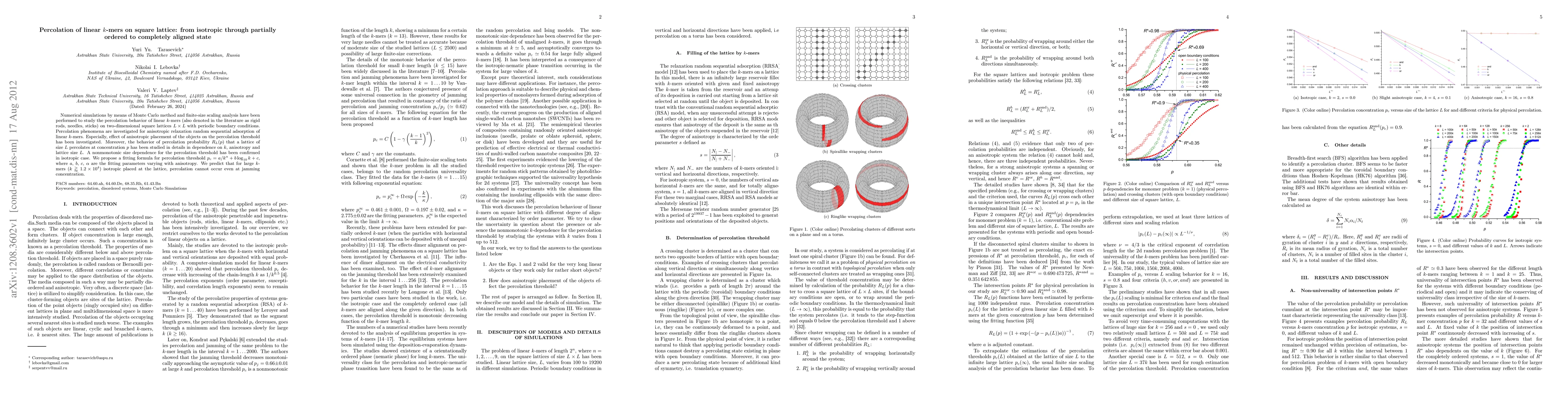 This paper investigates the percolation behavior of linear $k$-mers on square lattices using Monte Carlo simulations, focusing on the effects of anisotropy and object size on percolation thresholds. A nonmonotonic size dependence is confirmed, and a fitting formula for the percolation threshold is proposed.